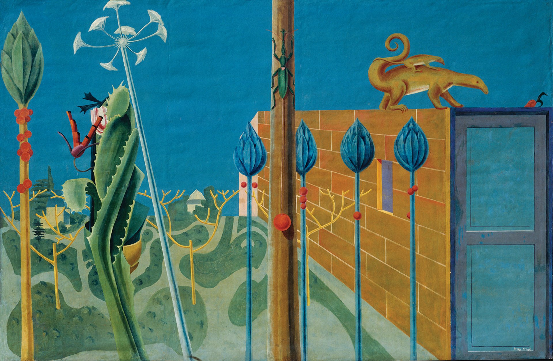 This early Surrealist work received special attention from conservators. Ernst painted the mural at the Eaubonne home of the poet Paul Éluard and his wife Gala, with whom he was having an affair. The oil on plaster was rediscovered under layers of wallpaper in 1968 and transferred to canvas.