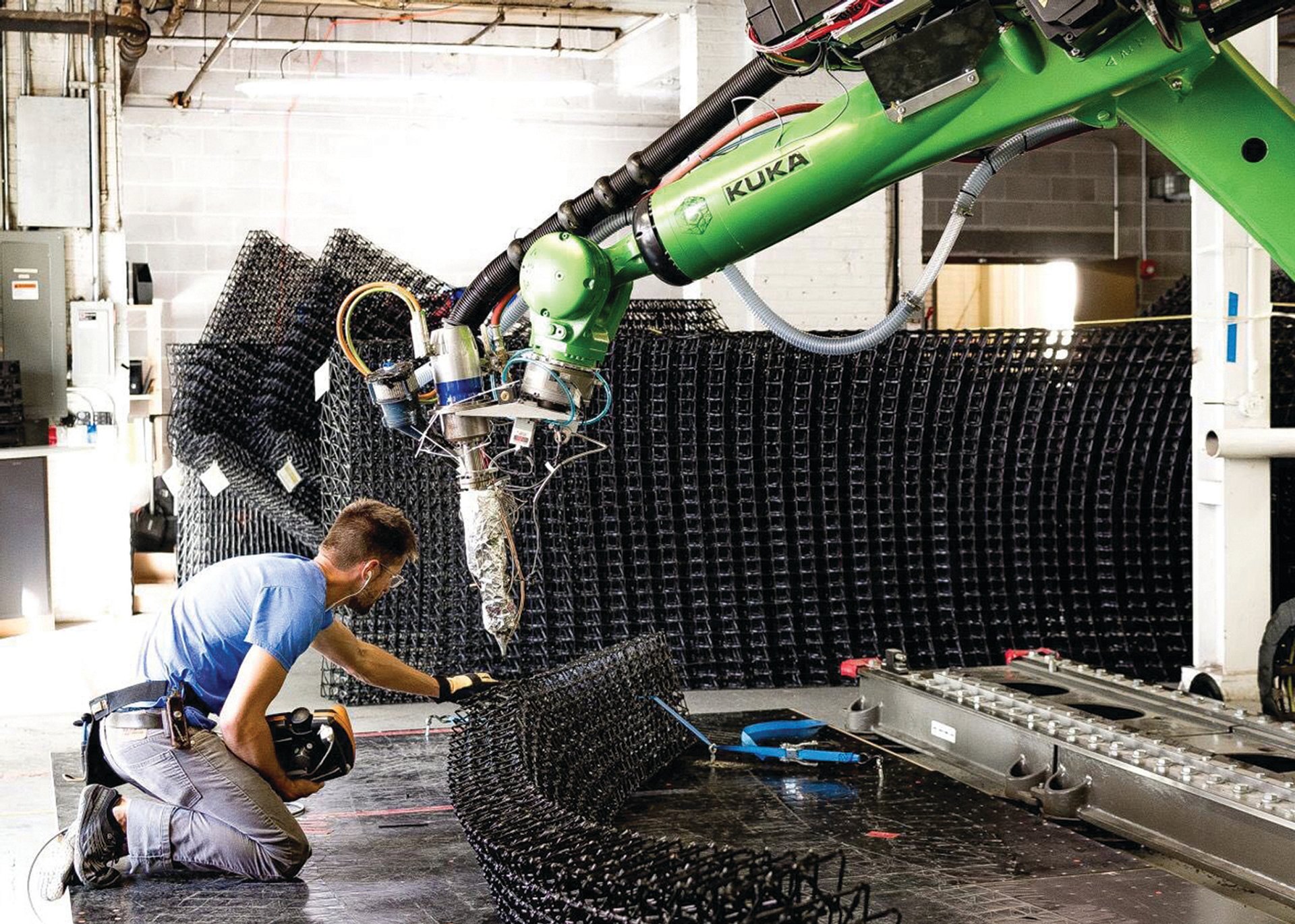 We worked with two companies: Branch Technology based in Chattanooga, Tennessee and Oak Ridge National Laboratory (ORNL), which produced three-dimensionally printed bamboo. We thought that could be an nice intersection between furniture and art. ORNL actually broke the Guinness World Record for the largest solid 3D-printed structure earlier this year [when it created a tool to be used for building Boeing jets], so they are breaking their own record with this pavilion.