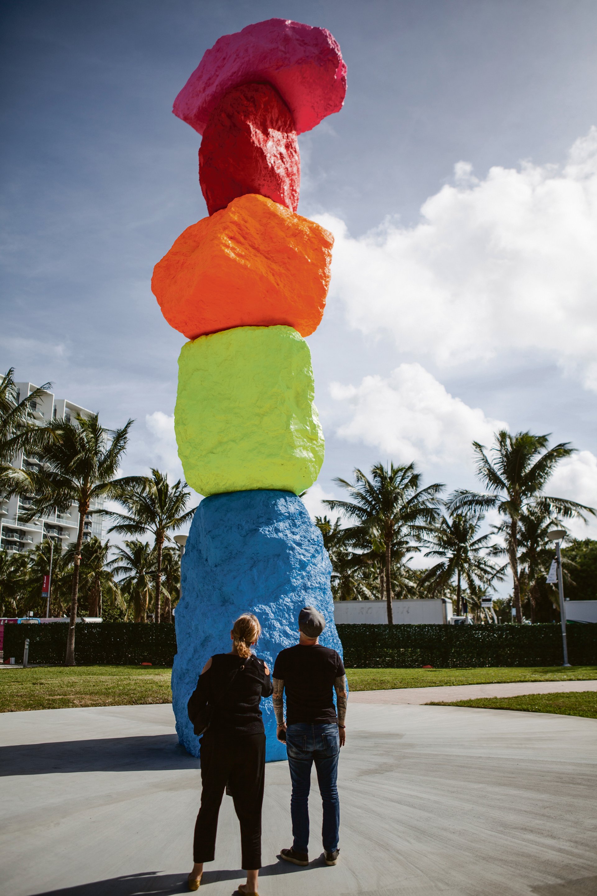 “I feel very connected to Ugo’s piece, which relates to Human Nature, his 2013 Public Art Fund commission for Rockefeller Center. That’s when he first started using colossal blocks of stone. But here the rocks are intensely coloured, which he began to do for Seven Magic Mountains in Nevada [an installation in the desert that was organised by the Art Production Fund and the Nevada Museum of Art earlier this year]. It is an amazing translation to see the largest one yet in a subtropical setting.”