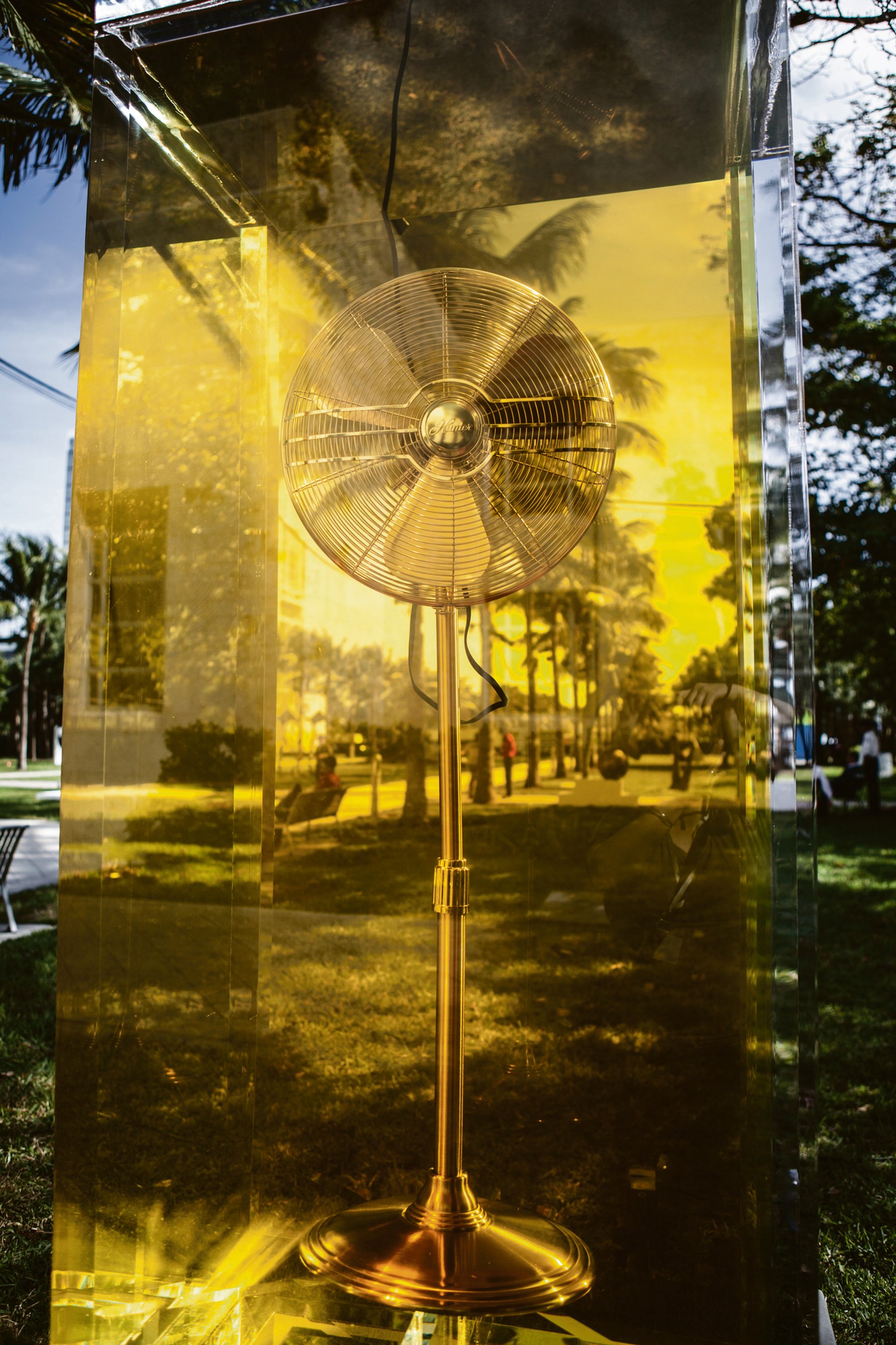 “The oscillating fan is encased in a canola oil-filled vitrine. It is a familiar object, meant to circulate air, but defamiliarised—it moves very slowly because of the heaviness of the oil.”