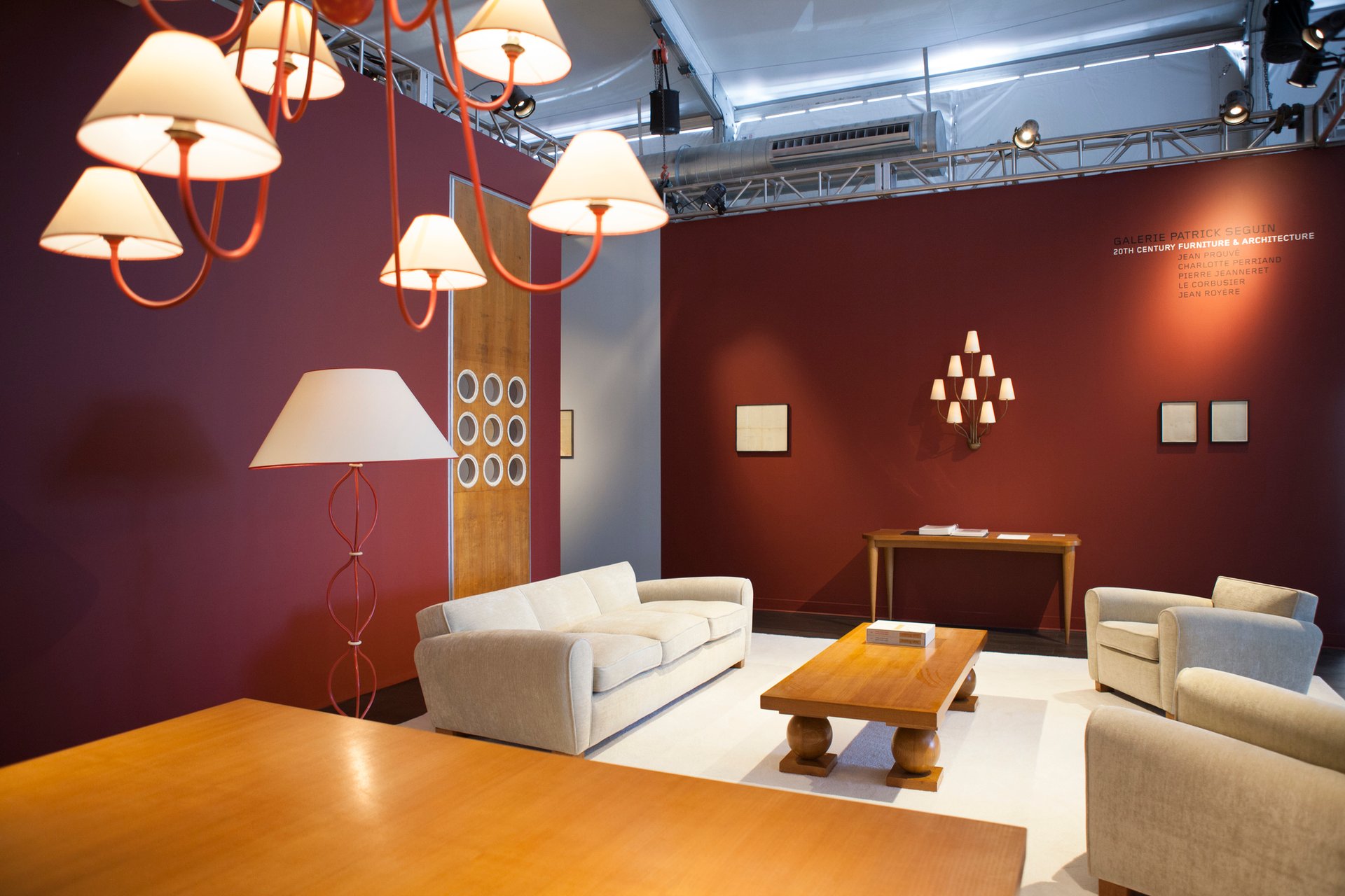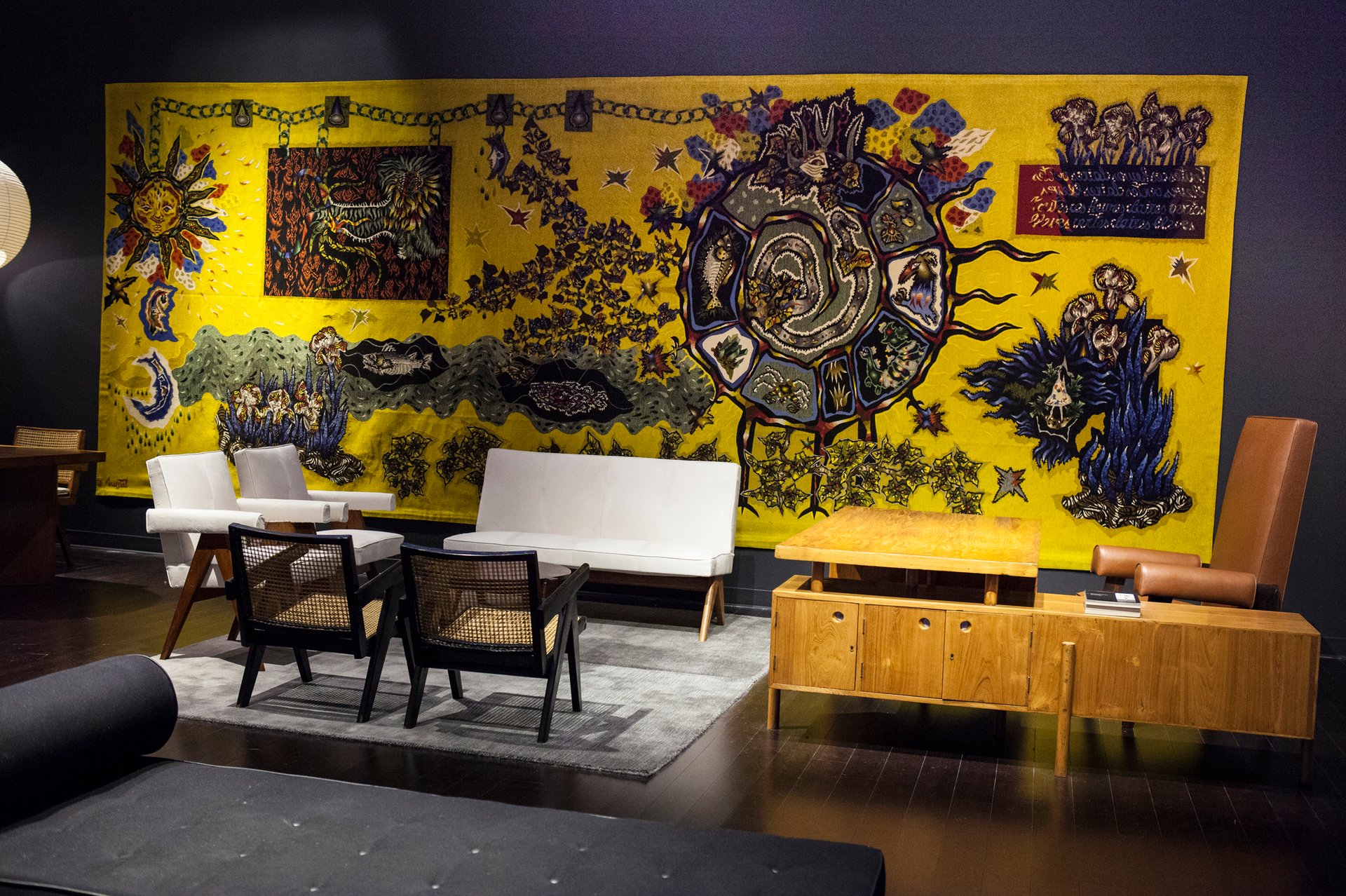 Although most of the Paris gallery’s stand is devoted to furniture by classic names such as Pierre Jeanneret, Le Corbusier, Charlotte Perriand and Jean Prouvé, a massive tapestry by the French artist Jean Lurçat dominates one wall. He started out as a painter and an engraver, but Lurçat embraced textiles in the 1920s and 1930s, creating costumes and decorations for ballets as well as tapestries. A second version of the piece on Laffanour’s stand is in the collection of France’s Cité International de la Tapisserie d’Aubusson museum.