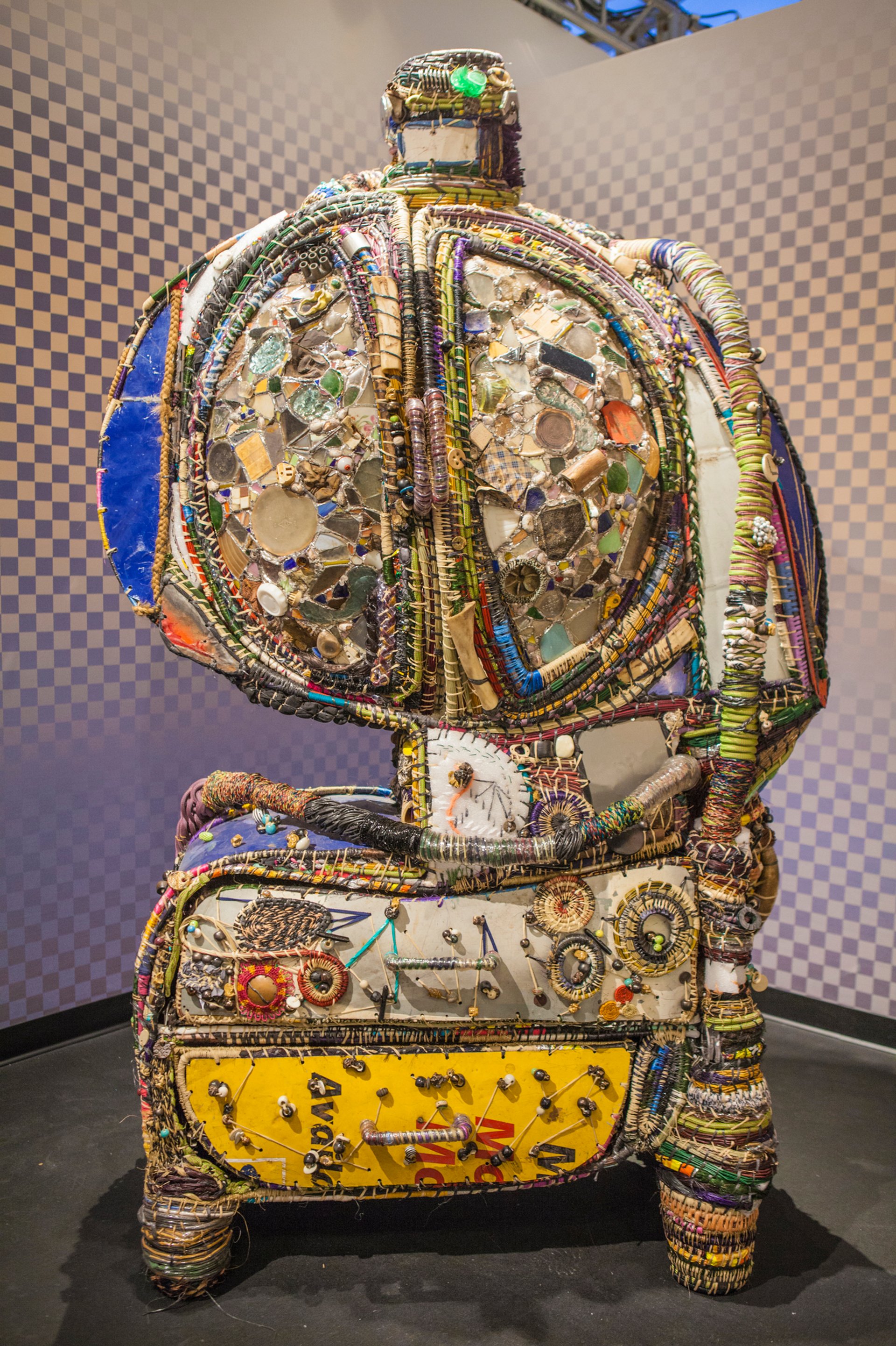 The recent RISD graduate Misha Kahn created this series of piecemeal cabinets after a trip to Swaziland on the southeastern coast of the continent. They are fabricated with the help of local African artisans, using upcycled detritus and found materials, including hair extensions, car parts, cow bones, soda cans, and even a busted iPhone.