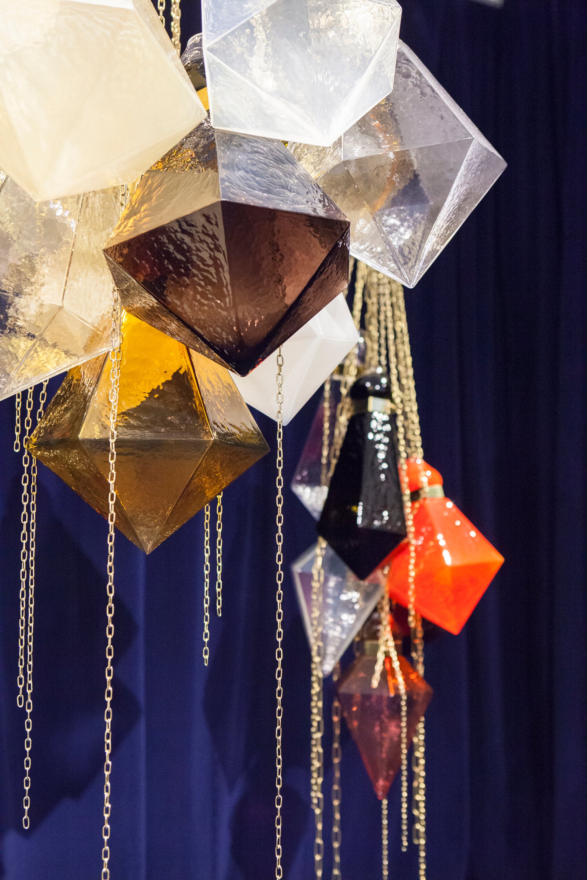 The New York gallery started out in 1998 with a strong focus on classic 20th-century Nordic design but has expanded its programme to include more contemporary work, especially by female artists. Dangling in a velvet-lined corner of the stand, as if in an oversized jewel box, is a series of pendant sculptures by the Swedish artist Frida Fjellman. Hand-blown into moulds to resemble faceted gemstones and strung up by delicate gold chains, the clusters can be lit from within to serve as a luxe chandelier.