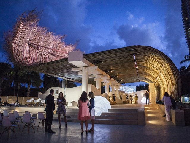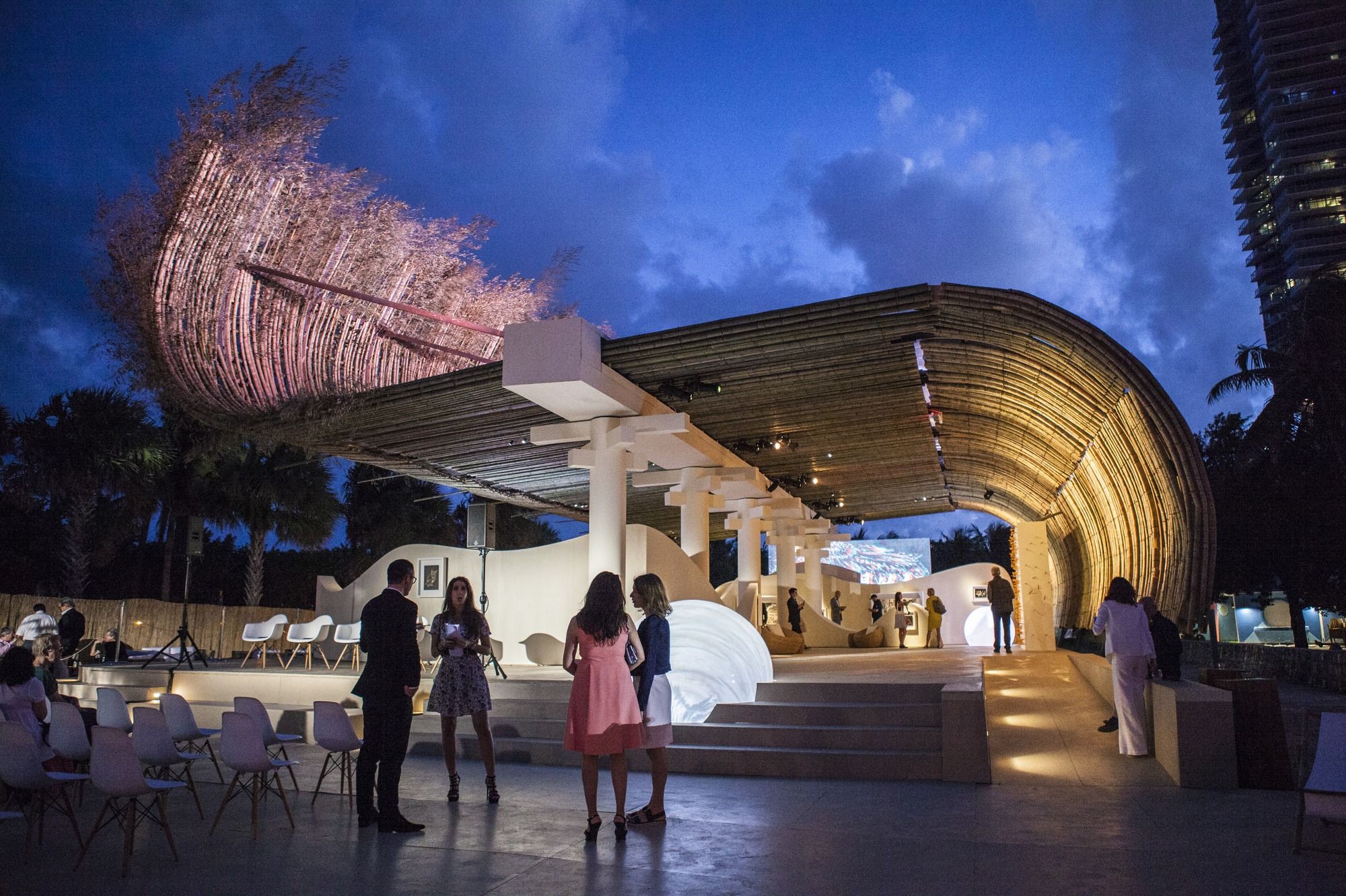 Wednesday evening marked the public opening of Public, Art Basel in Miami Beach’s annual sculpture garden in Collins Park. Visitors took refreshments from Rob Pruitt’s Stretch, Grill and Chill (2016), a vintage white limousine ingeniously converted into a barbecue at one end and a beer cooler at the other. (Crisps could be had by reaching into one of the windows.) The normally peaceful park was transformed into a raucous scene by Naama Tsabar’s Composition 18 (2016), a sound piece in which three all-female bands competed for dancers’ attention by playing over each other. This was rounded out by Lady Bunny’s gloriously tacky Intergalactic Disco (2016), presented by the legendary drag queen herself. The queue for the dance went deep into the park, but inside Public’s curator, Nicholas Baume, could be seen boogying to Robin Thicke’s Blurred Lines with one of the alien robots in attendance, who boasted coloured lights on their fingers and were resplendent in silver sequined body suits.