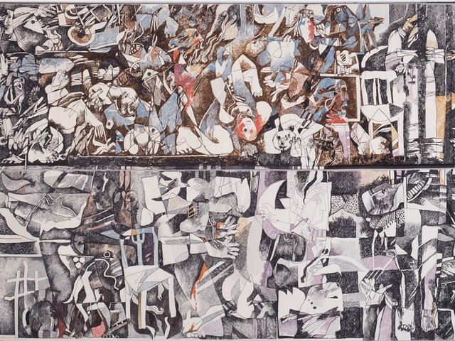 Al-Azzawi made his original ink-and-crayon drawing in response to the slaughter of hundreds of Palestinians by Lebanese Christian militia groups in areas under control of the Israeli military. He completed the large work in 1983. Two years ago, the Tate in London bought Al-Azzawi’s original drawing. The work is now on loan for an exhibition of the artist’s work at the Mathaf Arab Museum of Modern Art and the Qatar Museums Gallery Al Riwaq in Doha (until 16 April 2017).