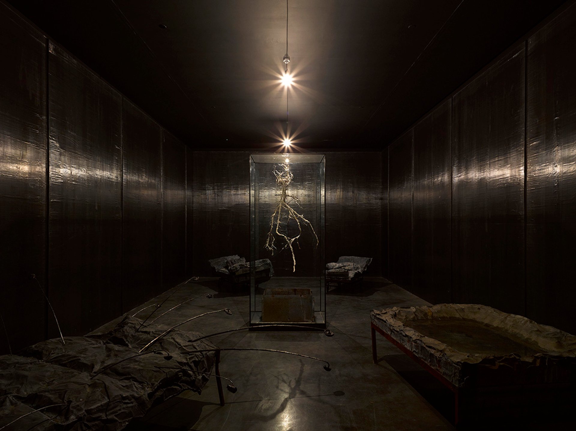 Both literally and figuratively, Walhalla is a weighty show that amply lives up to its expansive Wagnerian title and in which no production expense has been spared. Of course there’s lashings of Kifer’s trademark lead, the only material he considers to be “heavy enough to carry the weight of human history”. There are lead-encased door frames (which anxious attendants warn you not to touch); the initial dimly-lit metallic chamber is lead-lined and filled with a double procession of grim hospital beds draped with dusty crumpled lead blankets; and lead fills another library room groaning with ceiling-high shelves of toppling lead books and chunks of redundant machinery.