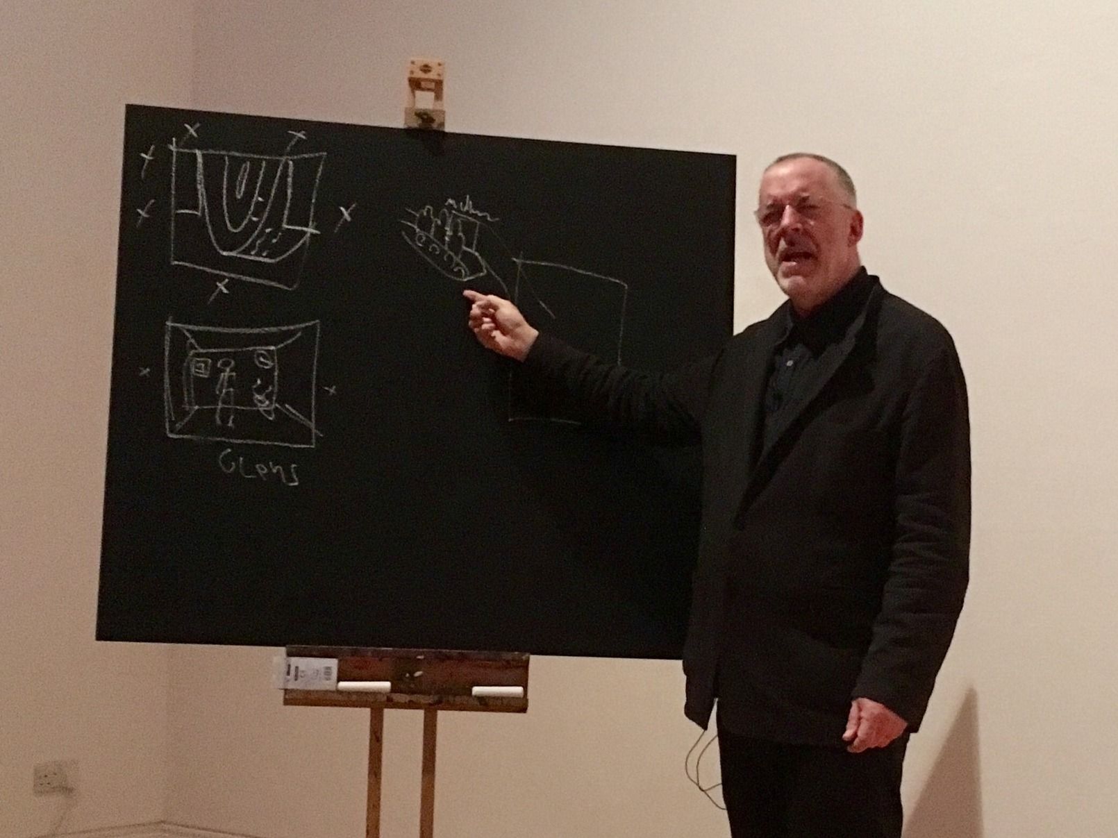 First, there were chalked-up diagrams on a blackboard including one of a pre-birth artist on a conveyor belt, where “I chose my parents”, along with his images of heaven, hell and fate. Then a series of 100 projected-images took us from the head of a corpse in a morgue—juxtaposed with that of a 1930s doll—to a diagram of the five worlds of meaning and materials, with Mullican using your correspondent’s keys as an extra prop.