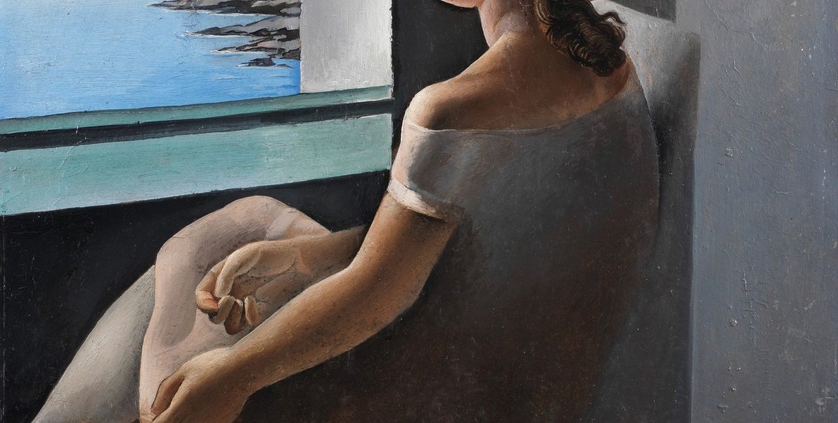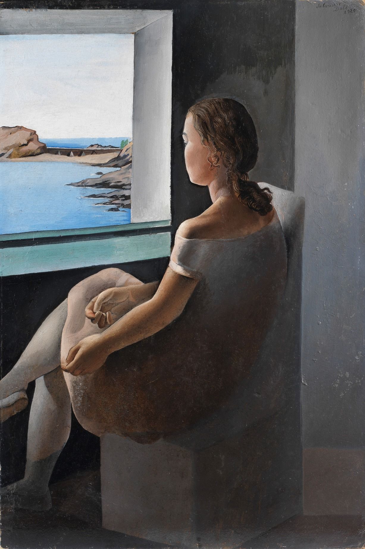 Figura de perfil (La Hermana Ana María) (1925) depicts Ana María sat looking through a window at the Cadaqués coastline in north-eastern Spain. As with many of Dalí’s paintings of his sister, Ana María’s bottom is accentuated—a feature he stressed even more in a later version of the canvas, Young Virgin Auto-Sodomized by her Own Chastity (1954).