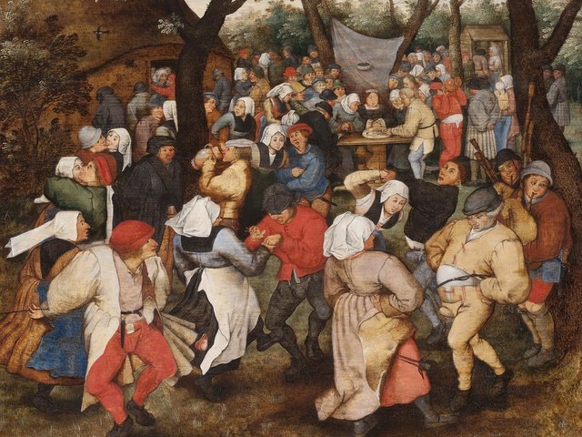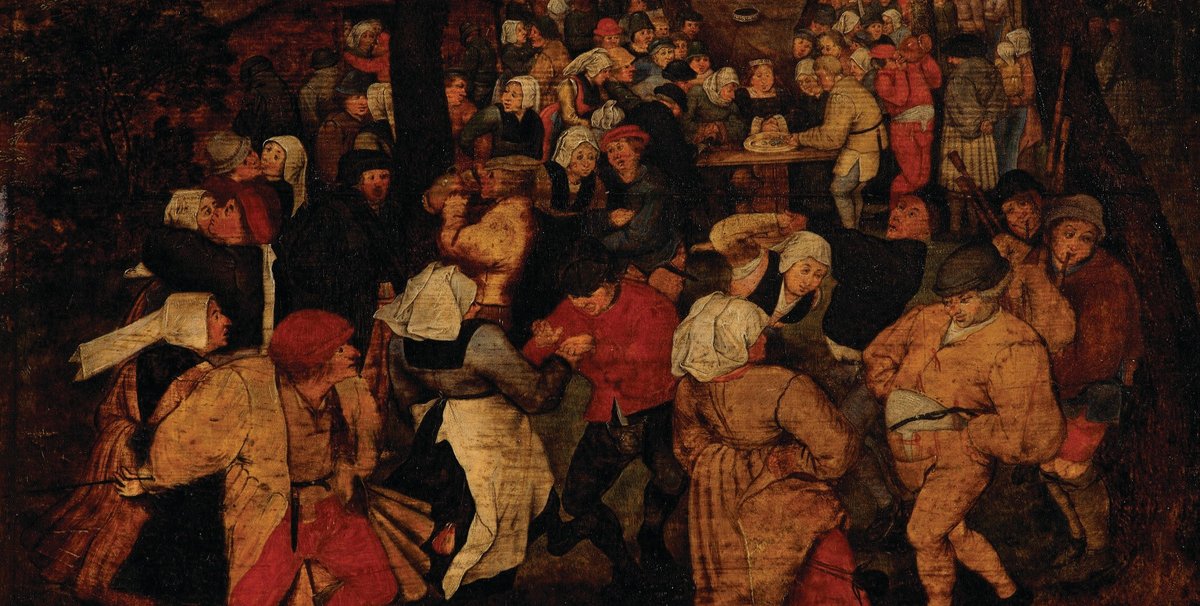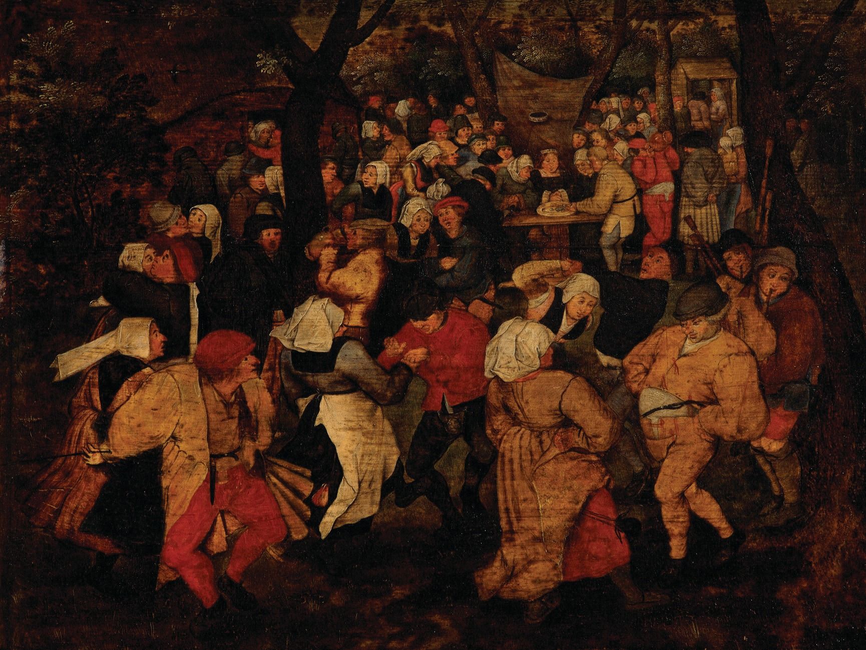 The composition was inspired by a lost painting made by the artist’s father, Pieter Bruegel the Elder, who was renowned for his peasant festival scenes and went to great lengths to perfect his compositions, even masquerading as a reveller to observe unnoticed. After his death at the age of 44, Pieter Brueghel the Younger and his brother Jan Brueghel the Elder (both of whom reinserted the “h”, dropped by their father, into their surname to distinguish themselves from their illustrious parent) produced copies of their father’s work in addition to creating their own compositions.