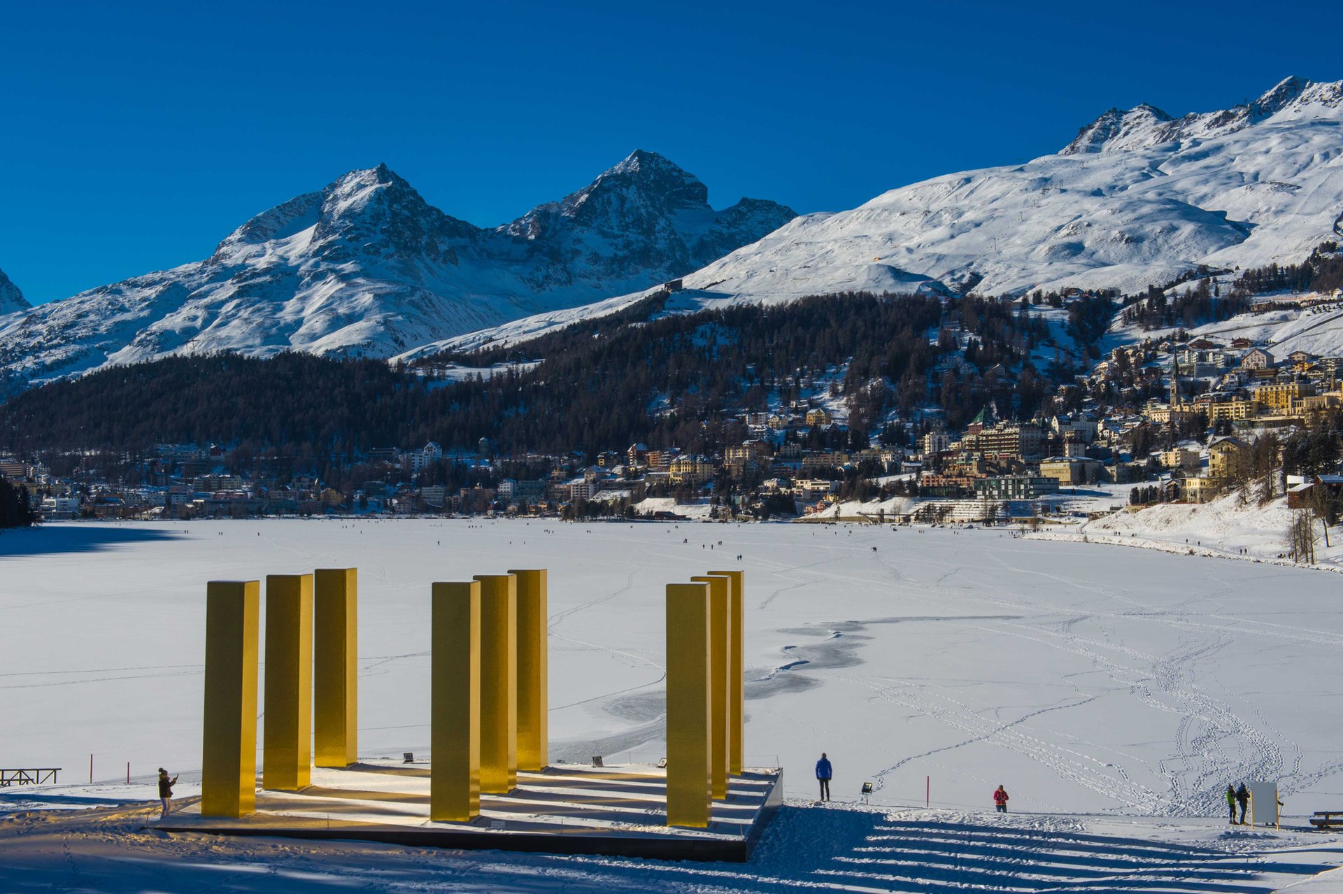 In the breaks between the slalom and the downhill, those traveling to St Moritz for this year’s FIS Alpine World Ski Championships (until 19 February) can also make time for some quiet reflection, courtesy of the German artist Heinz Mack. On a footpath by the city’s lake, framed by evergreen trees, the nearby mountains and with a clear view to the town, stand nine monumental golden columns, each more than seven metres tall and covered in hundreds of thousands of mosaic tiles.