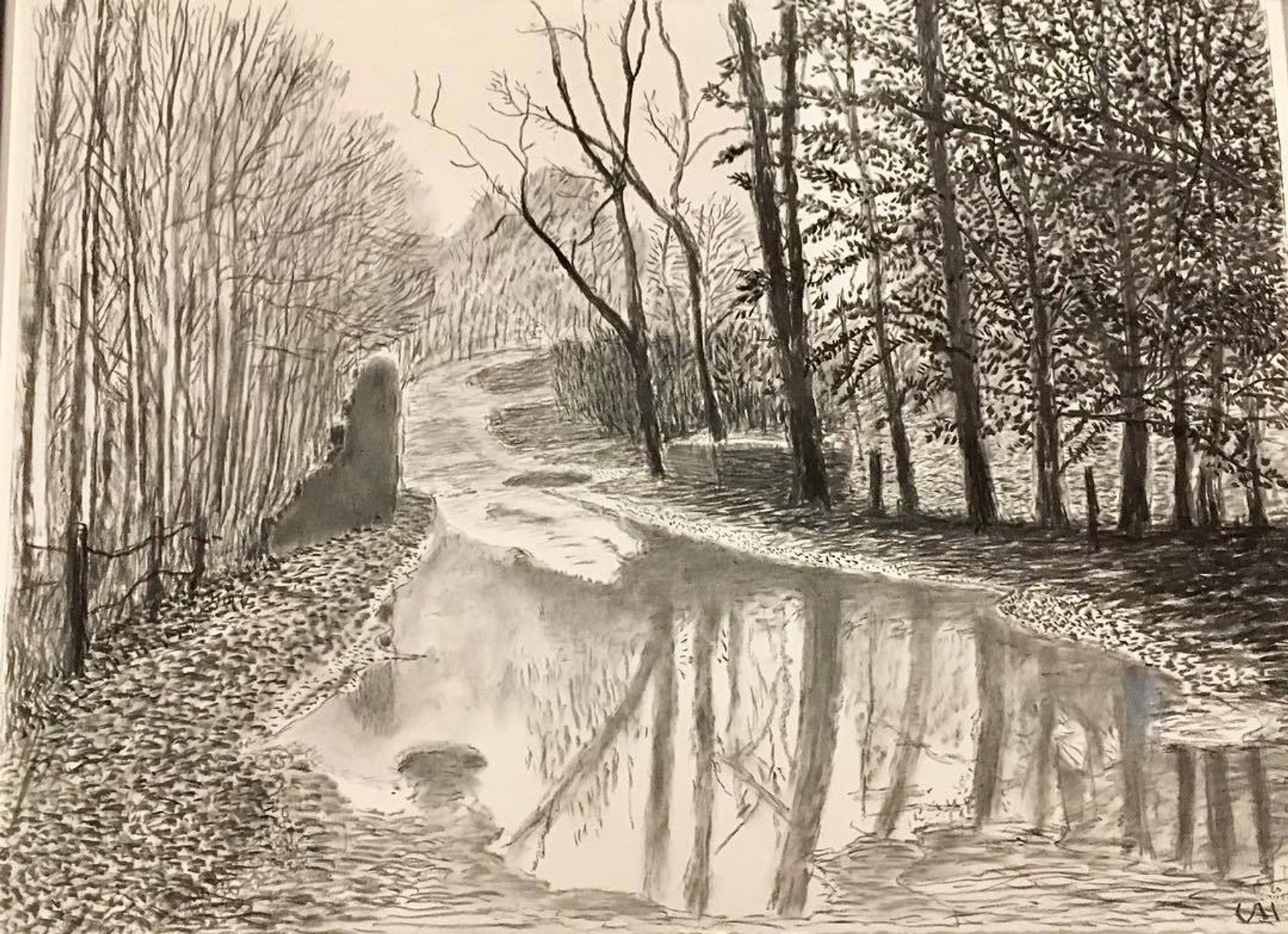 Despite the last room of the exhibition being vividly, alluringly alight with Hockney’s unfolding quick-fire drawings on his iPad, it is the quiet assiduously observed monochrome charcoal studies of texture, reflection and shadow that have stayed with me.