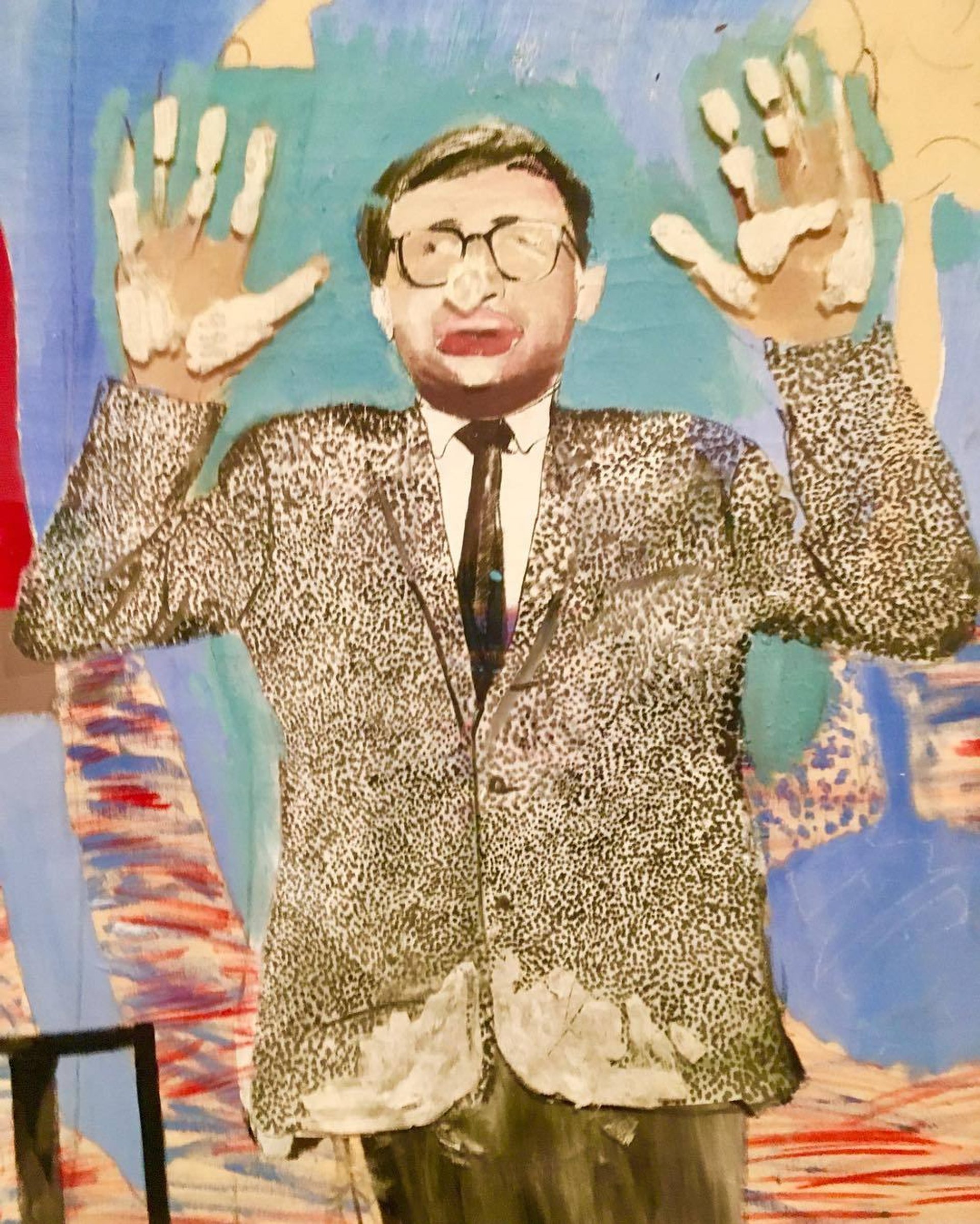 There is an abundance of style-switching and perspectival tricks in Play Within a Play (1963), which also hangs in the first room. A highly playful exercise in reality and illusion, we are eyeballed by Hockney’s dealer Paul Kasmin, who is seemingly squashed up against a sheet of real Perspex, with his pressed nose and hands conjured up in smudgy paint-prints. Behind Kasmin, hangs a tasselled curtain backdrop that is decorated with a lollypop tree and schematic figures.