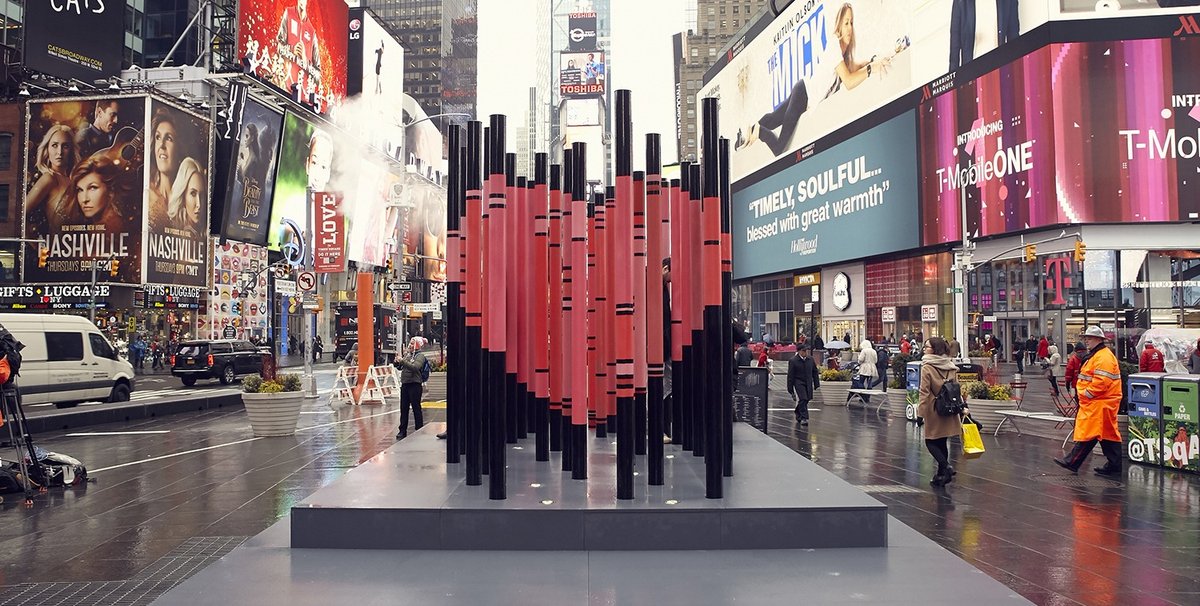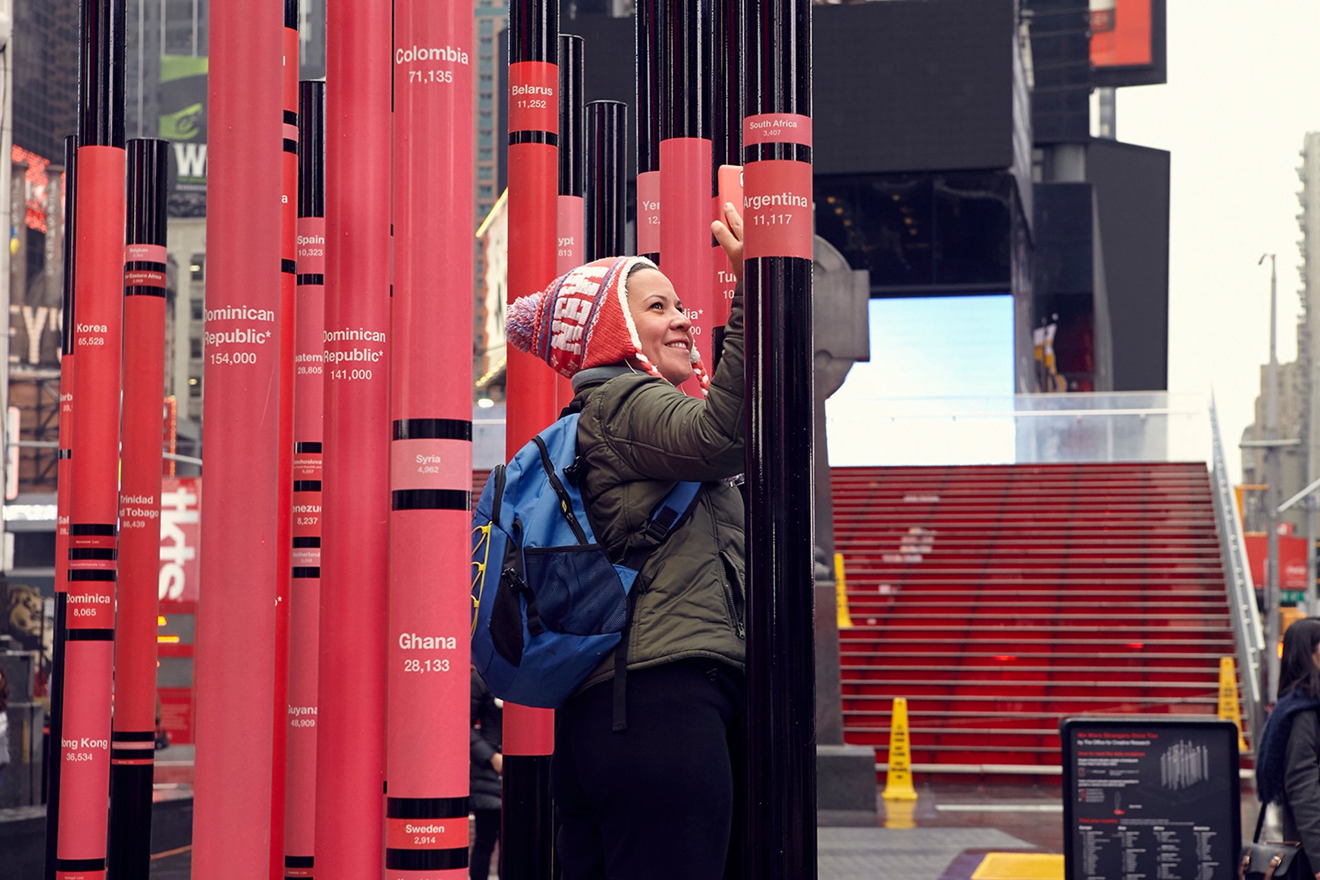 This Valentine’s Day, New York is showing love for its immigrant communities with an installation at Times Square, We Were Strangers Once Too, a reference to president Barack Obama’s November 2014 speech on immigration reform. The work—by the Office for Creative Research, a group that comes up with innovative ways to show and use data—is made of 33 metal poles coloured in red and pink blocks that reference the shifting populations of the city’s foreign-born residents, based on nationality. The colours on the poles align to form heart shape as you walk around the sculpture, depending on your point of view. “Now more than ever New Yorkers need to stand up and say we are proud to live in a city of immigrants,” the Office for Creative Research said in a press statement. The sculpture, which is the 2017 winner of the annual Times Square Valentine Heart Design competition, will be on view through March.