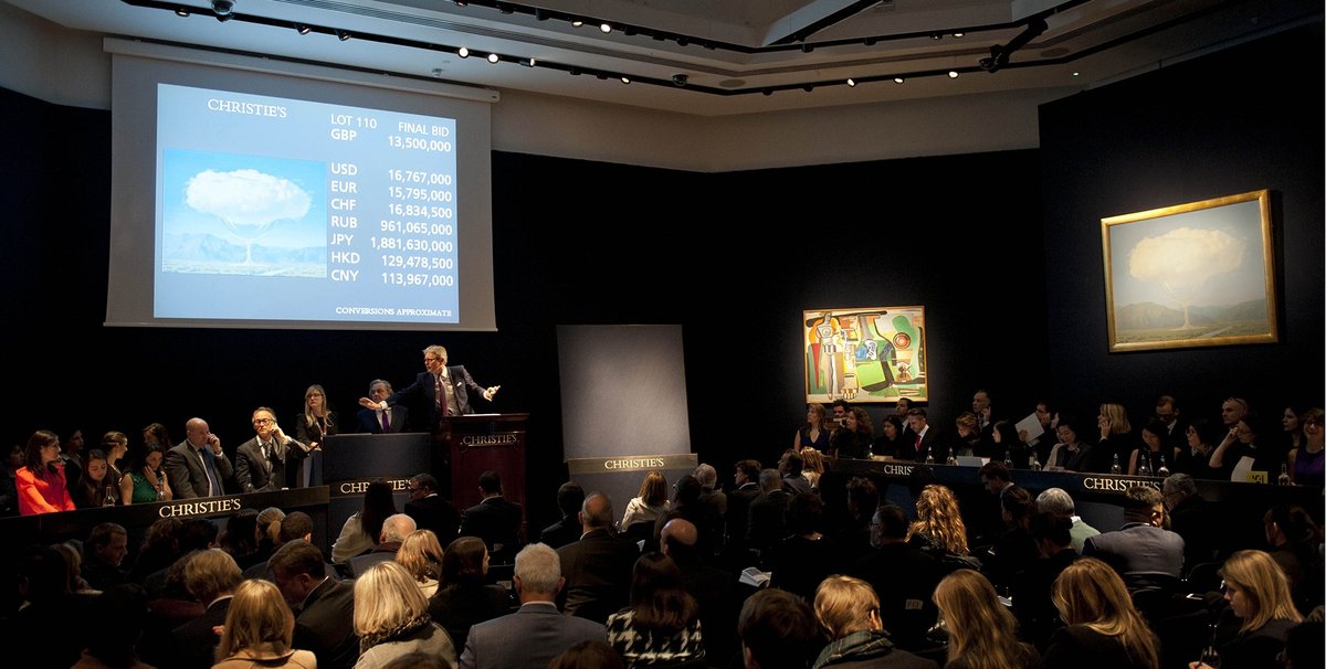 Among the highlights of the evening was a record for René Magritte’s La Corde Sensible (1960). It fetched a hammer price of £13.5m (£14.4m with fees) just short of its lower estimate of £14m, but this was nonetheless £5m more than the previous record for the artist. The work led the Surrealist sale, which achieved its highest-ever result at Christie’s (see below for numbers).