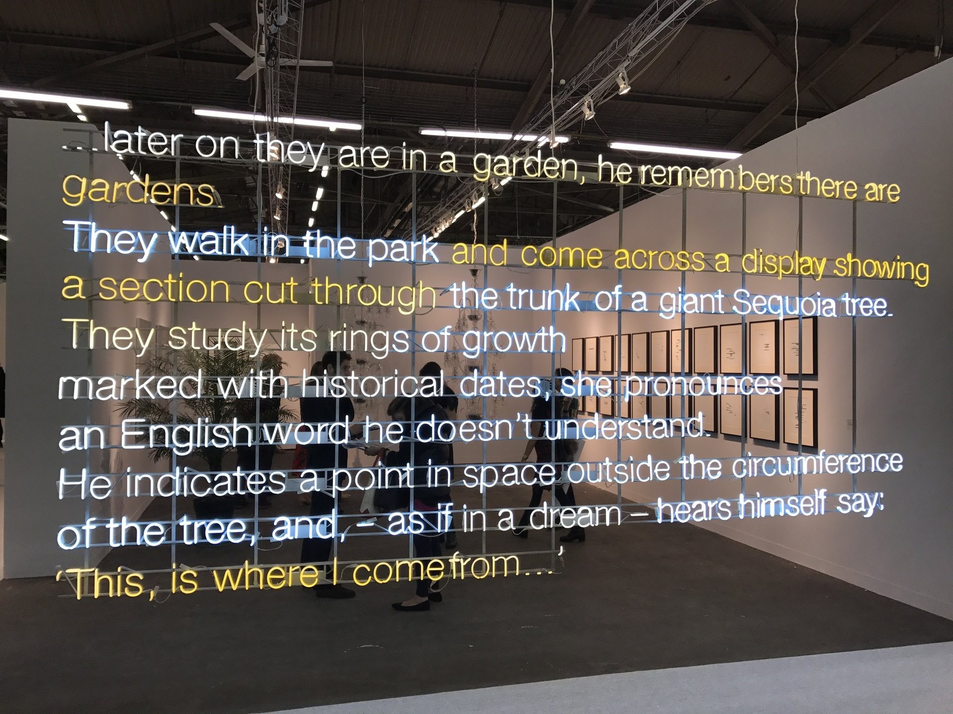 White Cube gave its space over entirely to the diverse work of Cerith Wyn Evans, the Welsh conceptual artist who will unveil a commission for Tate Britain later this month. The artist has a number of museum retrospectives coming up, director Peter Brandt explains, so they thought it was a good opportunity to introduce him to the market. “I think this is the first time we’ve done a solo booth, ever,” he said. The works range in price from $13,000 to $320,000, prices as diverse as the works themselves. These grab your attention first with “...later on they are in a garden...” (2007), a novelistic passage written in neon, to chandeliers and redacted block works on paper.