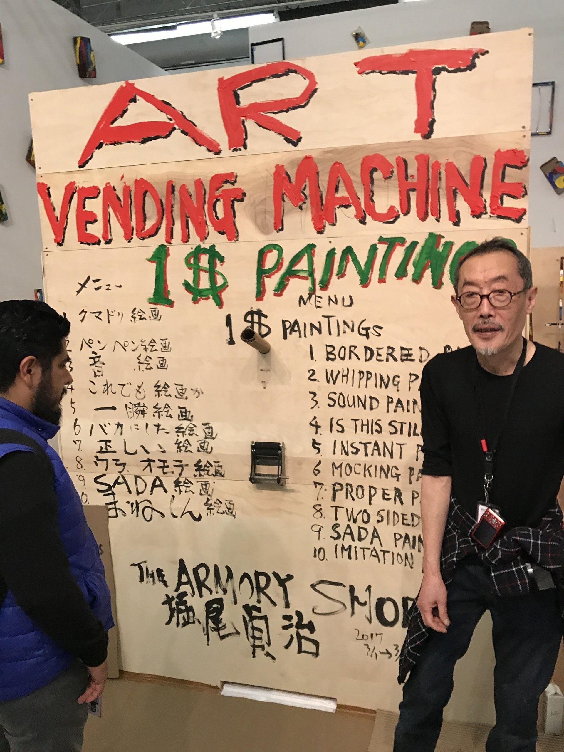 Axel Vervoordt Gallery’s ode to Gutai-associated performance artist Sadaharu Horio was wildly popular, thanks in part to its ART VENDING MACHINE feature, in which patrons may queue up to buy a work from the artist, who sits in a windowless plywood box that dispenses inky pieces on paper for a single dollar.