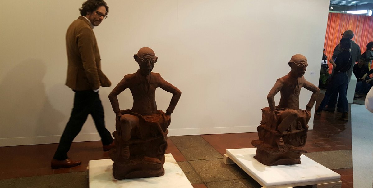 Their booth includes two editions of a chocolate sculpture, The Art Collector (2015, edition of five), by members Jérémie Mabiala and Djonga Bismar—plucked from the collective’s current show at the SculptureCenter in Queens for the duration of the fair—which satirises the familiar figure at fairs. The works are first sculpted in clay in Africa, then a 3-D scan of the models is sent digitally to the Netherlands, where they are cast in chocolate—a high-tech twist on the exploitative chocolate trade, explains the Dutch artist Renzo Martens, who is involved in the project.