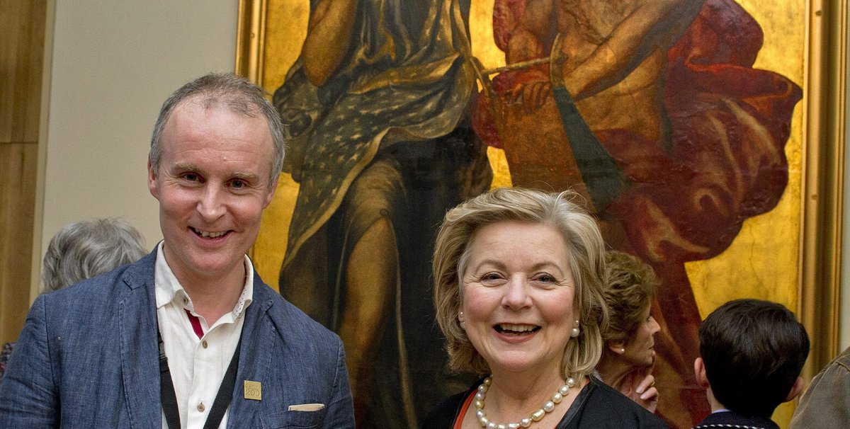 It seems that Hitler’s favourite architect Albert Speer found the art of Victorian artist George Frederick Watts to his taste. The exhibition at the Watts Gallery near Guildford, south of London, about Watt’s mural paintings (until 5 November) includes this Diana and Apollo executed to decorate the dining room of Virginia, Countess Somers’s London house, 7 Carlton House Terrace. This later became the German embassy and photographs taken just before the Second World War show the room remodeled in Speer’s pared away classical style, but with Watts’s picture cycle of the Elements carefully framed. Perdita Hunt, the outgoing director of the Watts Gallery, who has done an astonishing resurrection job on this artists’ village, has cleverly roped in the support of the descendants of the many Victorians painted by Watts, which is how our chairman, Anna Somers Cocks, comes to be photographed here, with curator Nicholas Tromans, after having made the opening speech. In it, she admitted that Watts’s mural paintings were not his greatest legacy (she rates him first, for his sculptures, second for his drawings and paintings), but that they need to be studied for a complete understanding of an artist who could reach great heights and who was so venerated in his time that the Metropolitan Museum’s first ever exhibition dedicated to a living artist was given over to him.