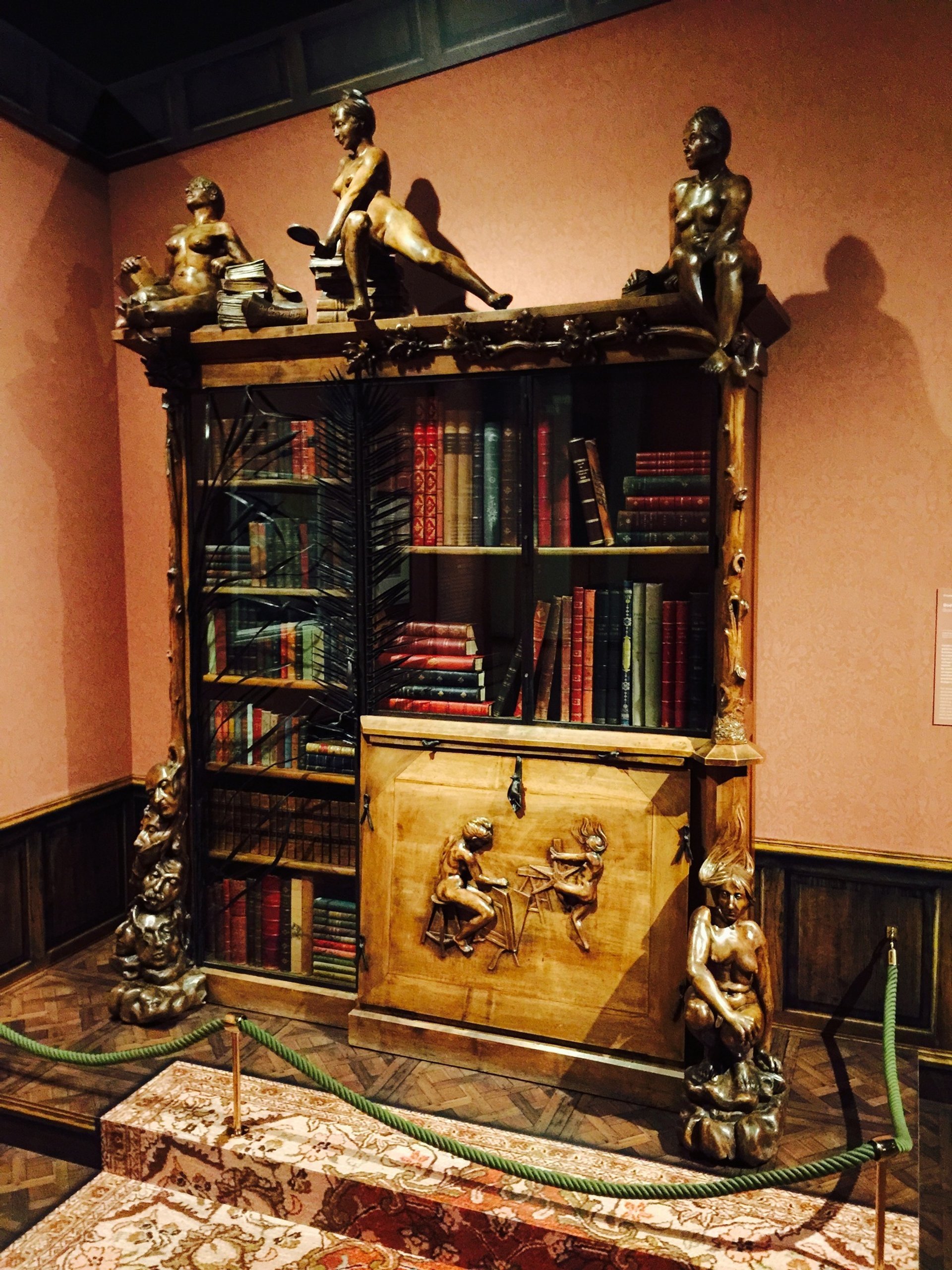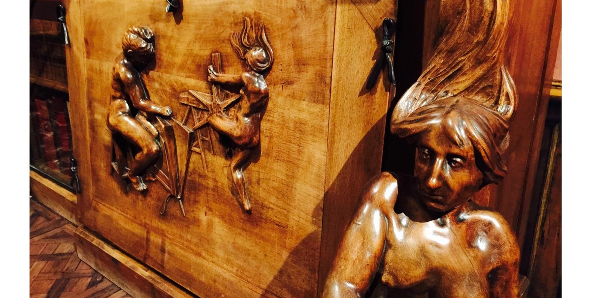 The 1890 walnut bookcase was commissioned by the wealthy engineer and amateur artist Henry Montandon. According to Fleur de Carvalho, the curator of the Amsterdam show, Montandon probably kept prized erotica in the lower print portfolio cabinet. The front of the cabinet is carved with two nudes in relief, one energetically astride a printing press and the other leafing through a print collection. An ironwork mouse serves as the cabinet’s handle.