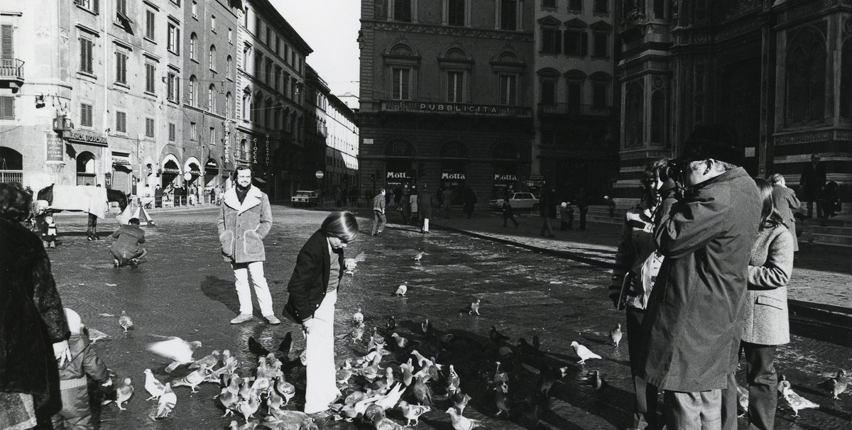 Could this be the first ever example of artistic photobombing? The year was 1975 and the young man in the wide-lapelled coat is the US artist Bill Viola. The image documents his performance Free Global Distribution (Surrogate Broadcast TV System), in which the artist tried “to secretly stand in as many tourists’ photographs as possible in one day on the streets of Florence”, in this case in front of the Duomo.