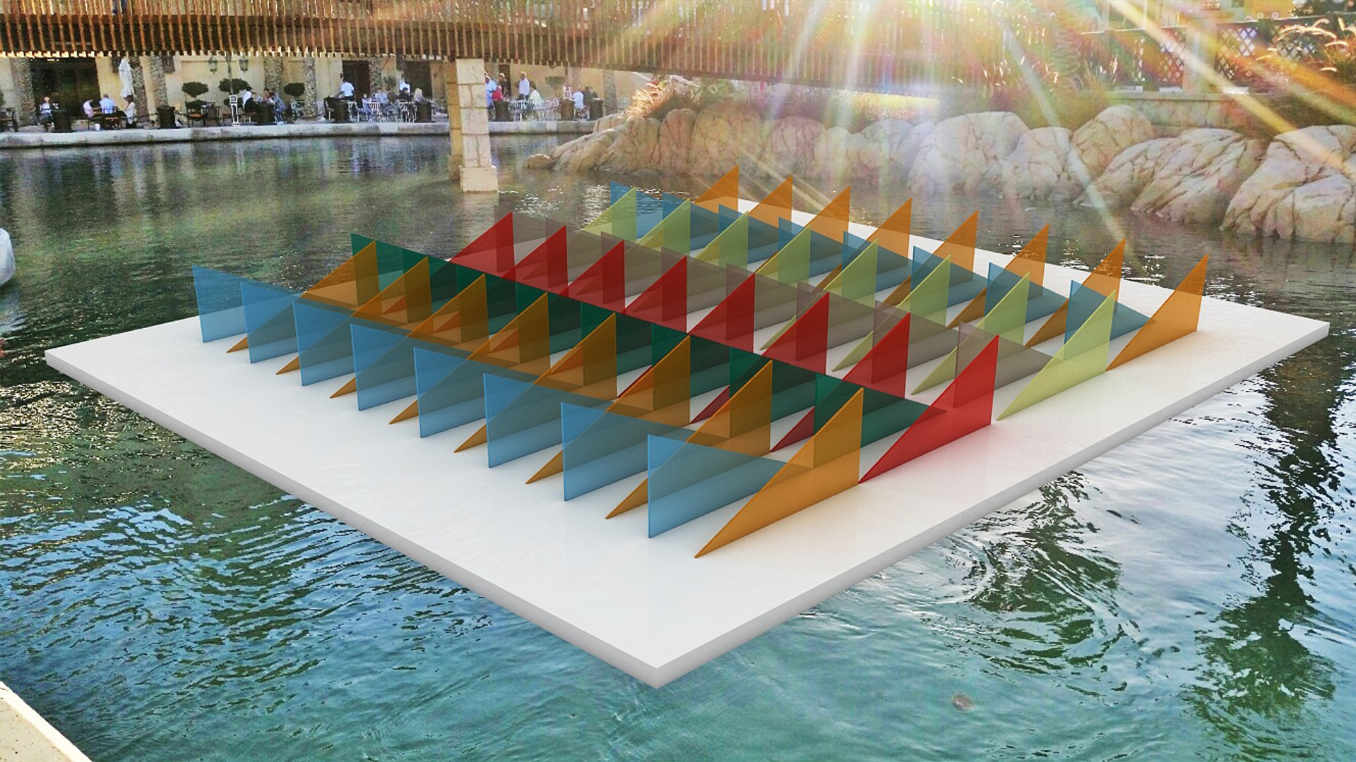 No. 695 is an approximately 10m by 11m installation of geometrically organised coloured, triangular glass panels, embedded into a floating base. On encountering it for the first time, it appears to be, almost literally, a colour field. Walk around it, gaze down its length, squint along its width, peer through its diagonals. As sunlight moves inexorably overhead, reflecting the surrounding waterway, the work constantly offers the viewer a unique visual moment, a poem of colour and texture.