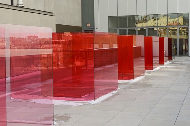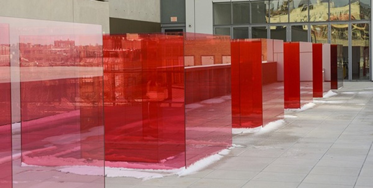 This likely explains the inclusion of some of the most handsome works in the show, such as Matt Browning’s sculpted grids, delicately and exactly whittled from single pieces of wood. In the current context, however, this handicraft tradition could seem quaint. The same goes for Ulrike Müller’s lovely wool tapestry of a cat, which would look good practically anywhere. On the other hand, Larry Bell’s installation Pacific Red II (2017) would not look as well in, say, a basement as it does on the museum’s open-air fifth floor terrace, where the sun illuminates Bell’s red glass boxes, each of which appears a shade brighter than the one before. It is an optimistic work and proves that the Minimalist Old Masters still have power. It is also reminder that a show without any hopefulness would be unbearable. But it does not carry the disquiet one would expect from a work created so recently.