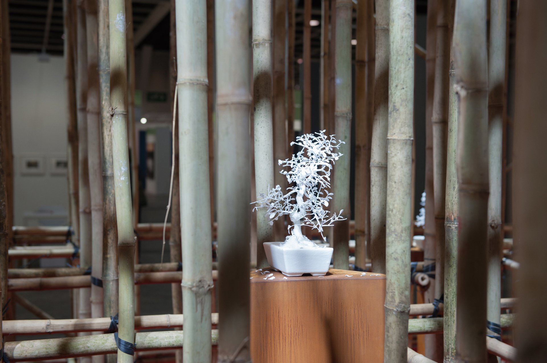 “Rirkrit’s new work is a labyrinth into which he’s inserted a series of plinths that appropriate Constantin Brancusi’s wooden plinths. Atop them are bonsai plants. Bonsai traditionally required great care and attention, but who has time any more to nurture the bonsai tree? Rirkrit’s bonsai are made through 3D laser printing. The living material of the pedestal is itself an appropriation of Brancusi. Rirkrit has worked with bamboo before. It’s so familiar and readily available in this region. I love that audiences here will make contact in a different way with something that you see on the streets.”