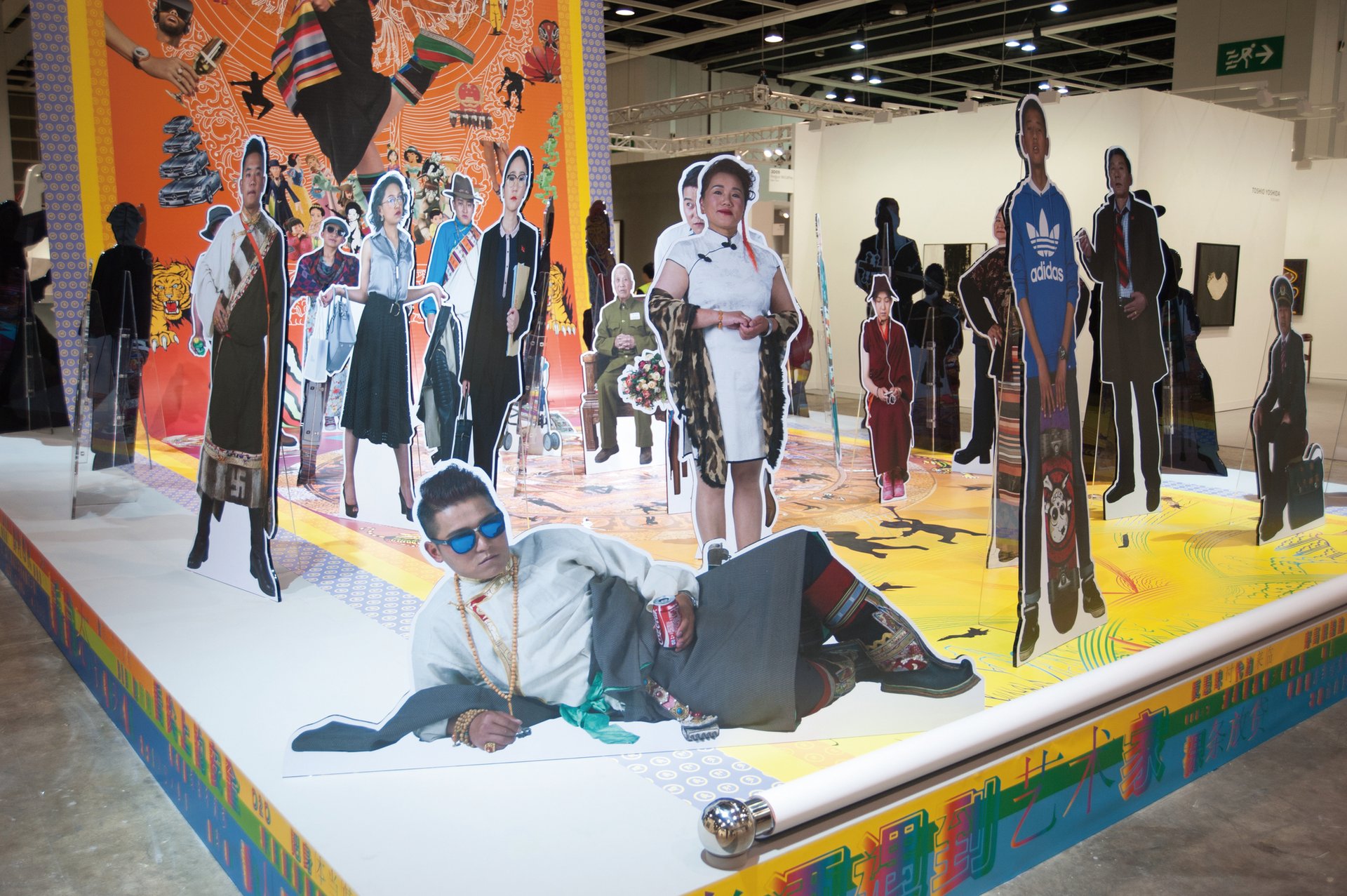“Gonkar is of Tibetan heritage and this is an extraordinary mise-en-scène of 30 members of his family as cut-outs with three different types of persona. They’re wearing clothes that speak to traditional Tibetan culture, clothes that speak to their everyday life and an outfit in their professional guise. He wanted to look at how the introduction of new goods and commodities is shaping a new kind of Tibet. What does it mean if a previously closed society evolves at such an accelerated pace? Who is at the frontline of experiencing that change? I wanted those people at the frontline of Art Basel in Hong Kong.”