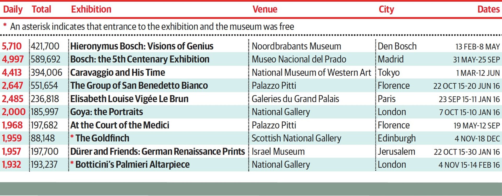 This year the crowds went bonkers for Bosch at both the Prado in Madrid and the Noordbrabants Museum in Bosch’s hometown of Den Bosch. The latter received its highest ever attendance in its 180-year history. Elsewhere, art-historical bye-ways were the name of the day, with the San Benedetto Group at the Pitti, the Fabritius’s goldfinch at the Scottish National Gallery, and the Botticini altarpiece at the National Gallery. It should be noted that the latter two were single-work shows with free entry—their popularity should be taken with a pinch of salt.