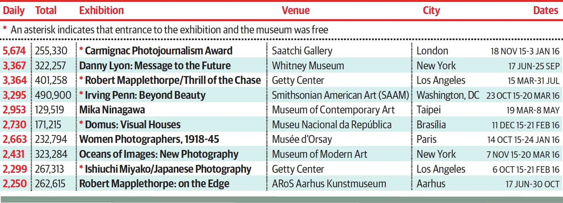 Some 70 years after his birth, the late Robert Mapplethorpe appears in the top ten twice. A paying exhibition at the Aarhus Kunstmuseum in Denmark attracted 2,250 visitors a day, but did not quite reach the heights of the free Getty Center show’s 3,364 visitors a day. Indeed, the Getty dominates the category, with three shows in the top 12. But this is one of the most pleasingly diverse lists, where solo and group shows, street and studio photography, Asian and US traditions, and leading art photographers and more commercial practitioners collide. Few exhibitions with an individual entry fee attracted big crowds: only the Aarhus’s Mapplethorpe and MoCA Taipei’s Mika Ninagawa shows feature in the top ten (entry to the rest was free or included in a general museum ticket). The category is topped by the winners of the Carmignac Photojournalism Award at the Saatchi Gallery, a show of six far from widely celebrated photographers, who drew around 2,000 visitors a day more than shows of greats such as Mapplethorpe, Irving Penn and Ishiuchi Miyako.