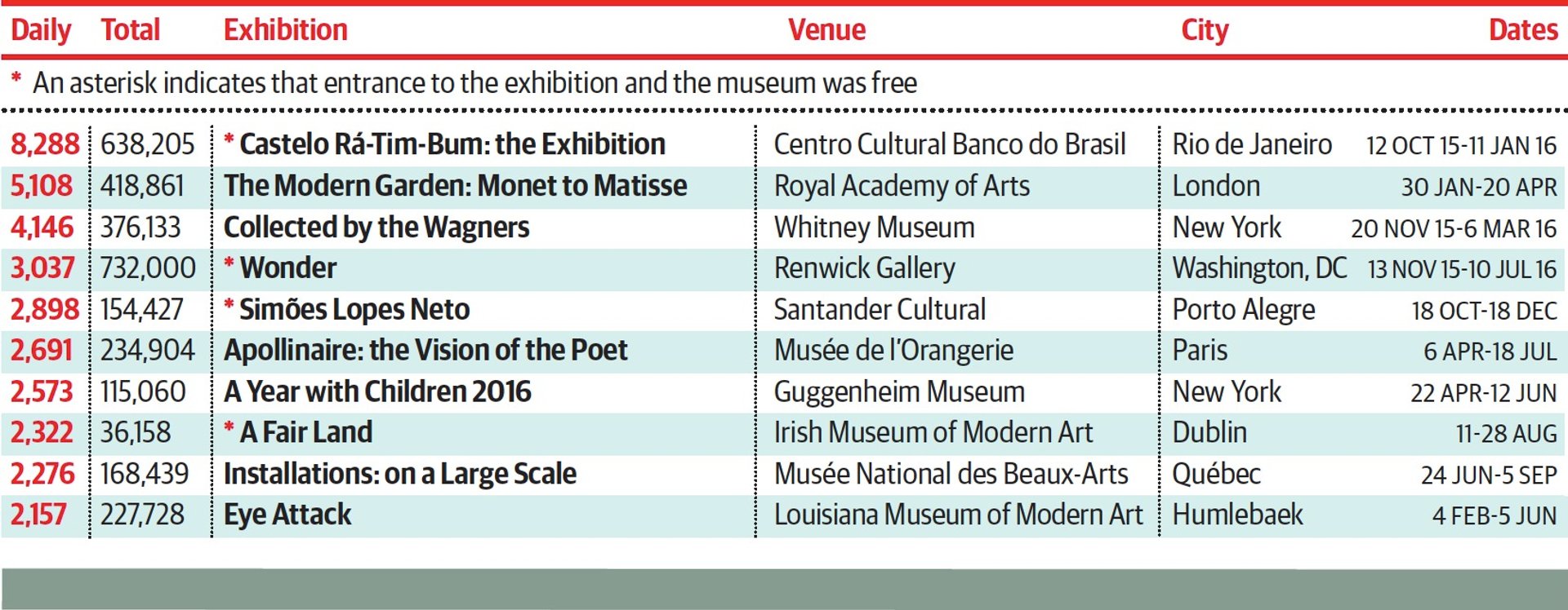 The Royal Academy of Arts claims the second spot with its garden exhibition, which featured canvases from the 1860s to 1920s by Monet, Renoir and Kandinsky among others. It drew 5,108 visitors a day, making it the fourth most visited show at the London museum in more than two decades. The rest of the top ten is rounded out with shows on everything from Guillaume Apollinaire as art critic to an artist’s village, complete with crops, staged in the courtyard of the Irish Museum of Modern Art.