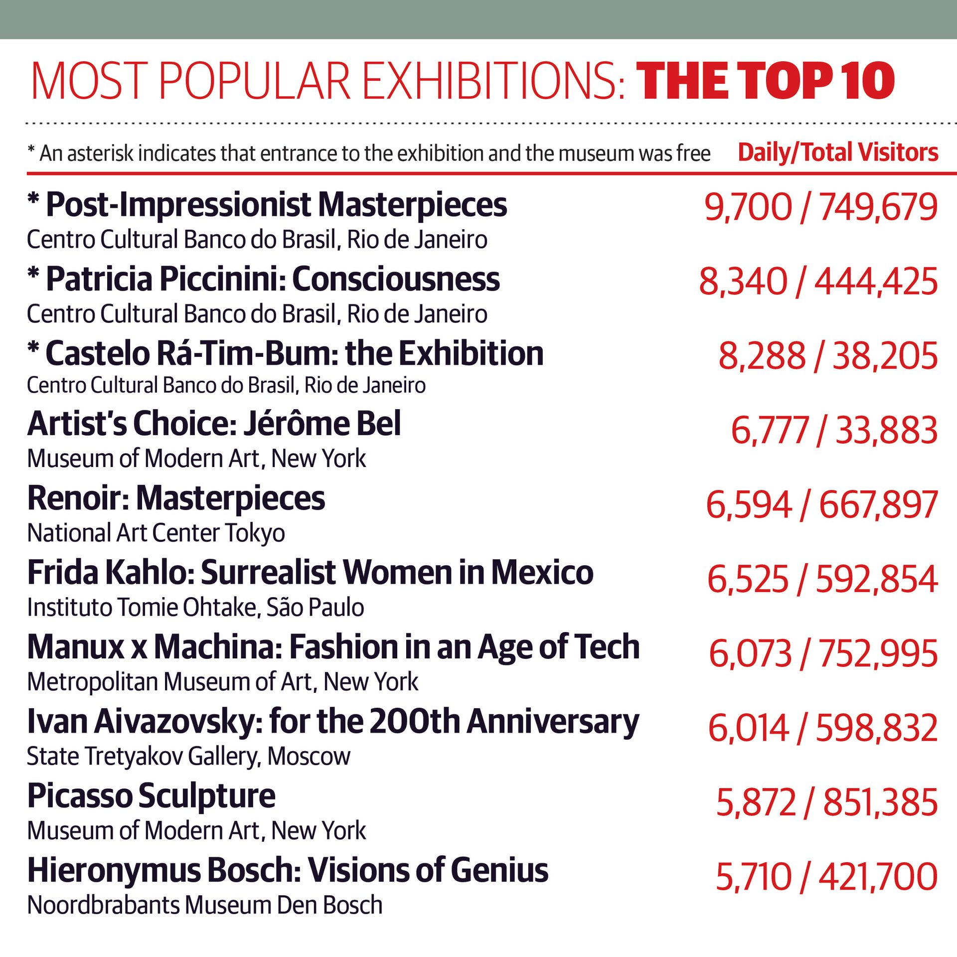 Methodology The daily figures are calculated automatically by our database, which computes the number of days for which an exhibition was open using the following formula: total number of days between start date and end date, divided by seven, multiplied by the number of days a week the institution is open, minus exceptional closures. All of the data used were supplied by the institutions concerned. Some institutions offer a number of exhibitions for a single ticket: these are shown as one entry. Exhibitions that were free to visit—ie neither the museum nor the show had an entry fee—are indicated with an asterisk (*).