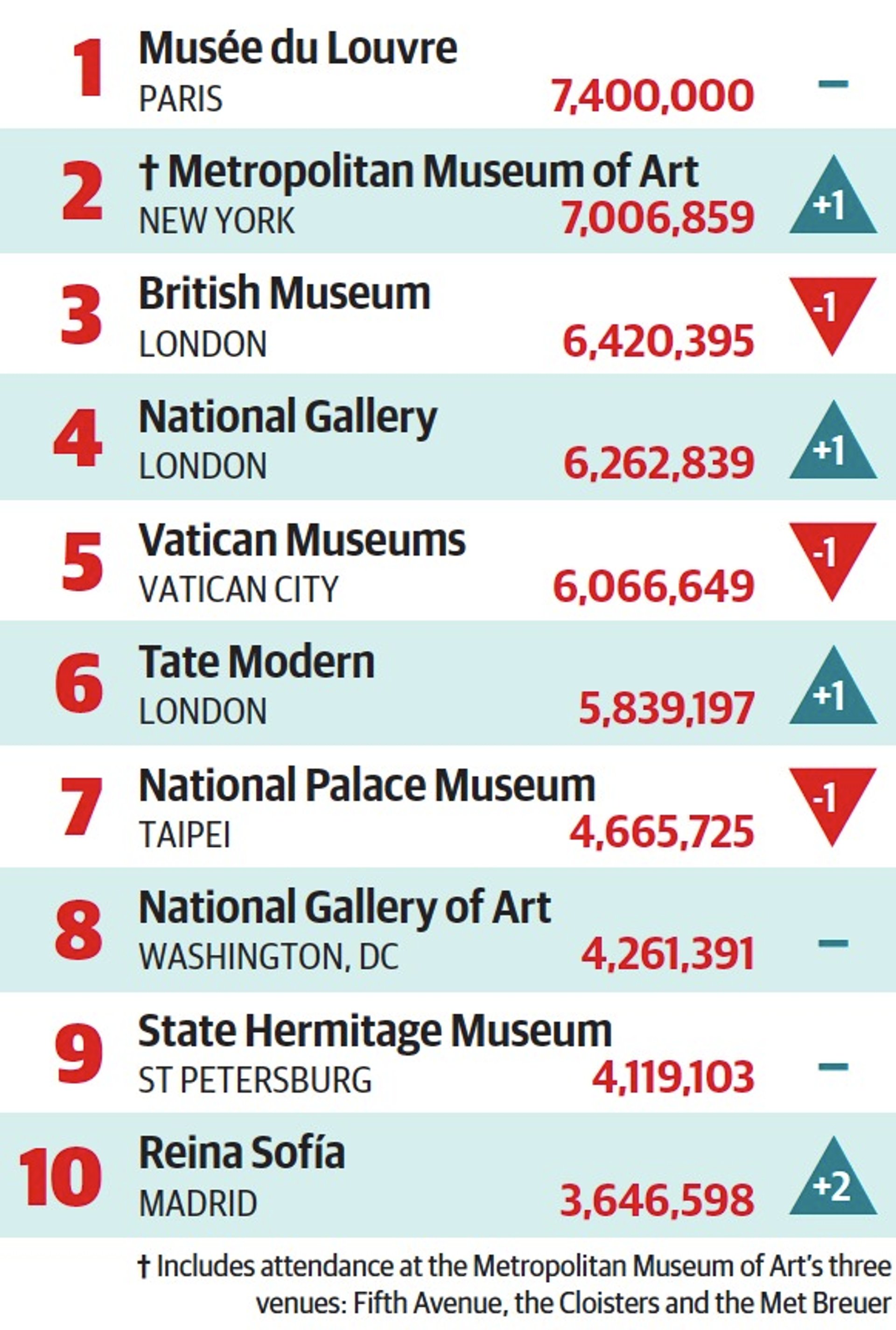 Gains and losses in London A slight fall in visitor numbers at the British Museum and an expansion at the Met mean that the London and New York institutions are now at level pegging. The Met does not separate attendance at its three venues: the Fifth Avenue flagship, the Cloisters in upper Manhattan and the Met Breuer, which opened in March 2016. Together, they attracted a record seven million visitors. In London, the single-venue, free-to-visit British Museum drew 6.4 million visitors last year.