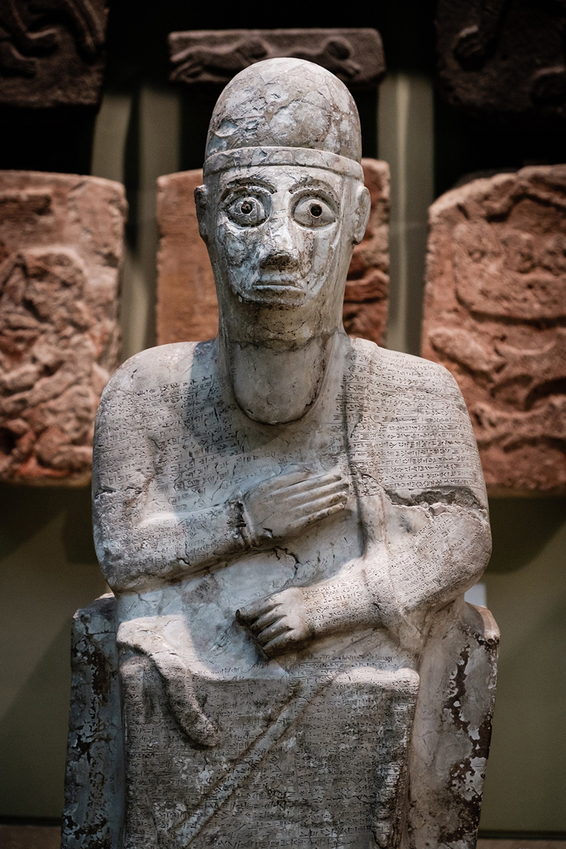 The statue of Idrimi, excavated at Alalakh in 1939 by the British archaeologist Leonard Woolley, is one of the gems in the BM’s collection. A 104-line autobiography by the king is inscribed on the stone, recounting his days as a political exile in the land of Canaan as well as his later military campaigns. Scholars consider the text to be one of the most significant cuneiform discoveries. “You don’t find political autobiographies of real people in the ancient Middle East, certainly not in this period,” says James Fraser, a project curator in the museum’s Middle East department. “A remarkable number of stories can be told through Idrimi’s life,” he says.