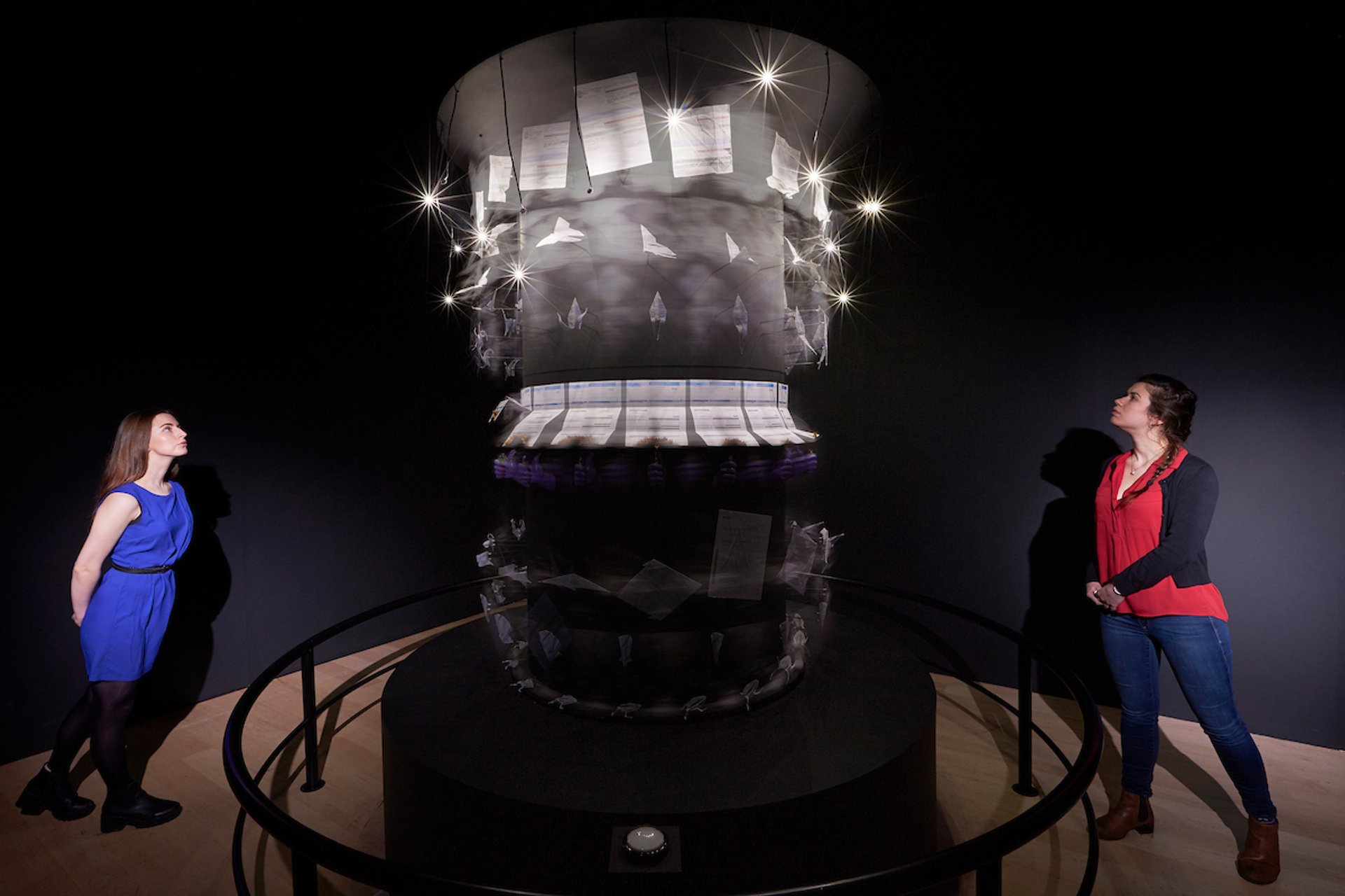 Camille Henrot is known for her idiosyncratically encyclopaedic world view that spans multiple histories, cultures and systems of categorisation. Here, she has created a spinning zoetrope that when hit by flickering strobe lights causes a series of origami creatures—fashioned from electricity bills—to repeatedly fold and unfold. Also on this dramatic carousel of never-ending excess and consumption, life-sized hands perpetually spark up cigarette lighters in an attempt to set these bills on fire.
