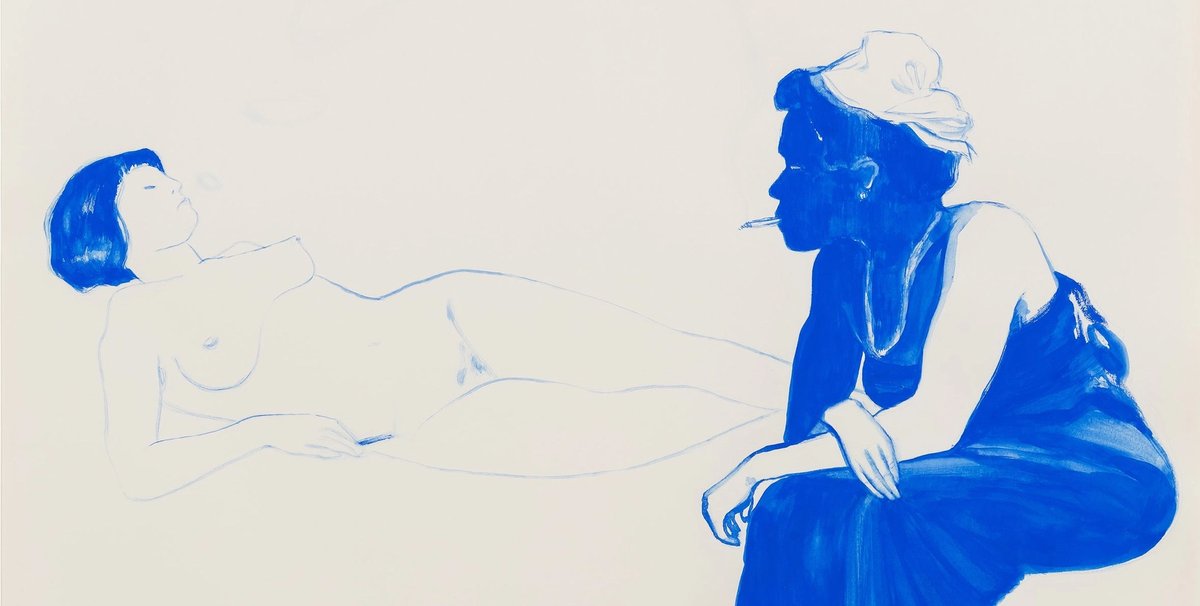 The use of blue—unmixed, straight from the tube—provides a certain illustrative distancing from these intimate scenes, as well as conjuring up a memory of Matisse’s blue nudes. Yet, while some of their gestures and the poses they strike can chime with art history—in a couple of pieces there’s a significant nod to Degas and Balthus—the women here are emphatically modern. They smoke, dance and stand around in their underwear. They examine themselves in the mirror, adjust their hair and get changed in convivial groups. At times they can be solitary, thoughtful and introspective but never passive. Brice’s fluid, spare and highly accomplished draughtsmanship underpins these works—they are simple, uncluttered and matter-of-fact. Her women claim their beauty and their bodies on their own terms.
