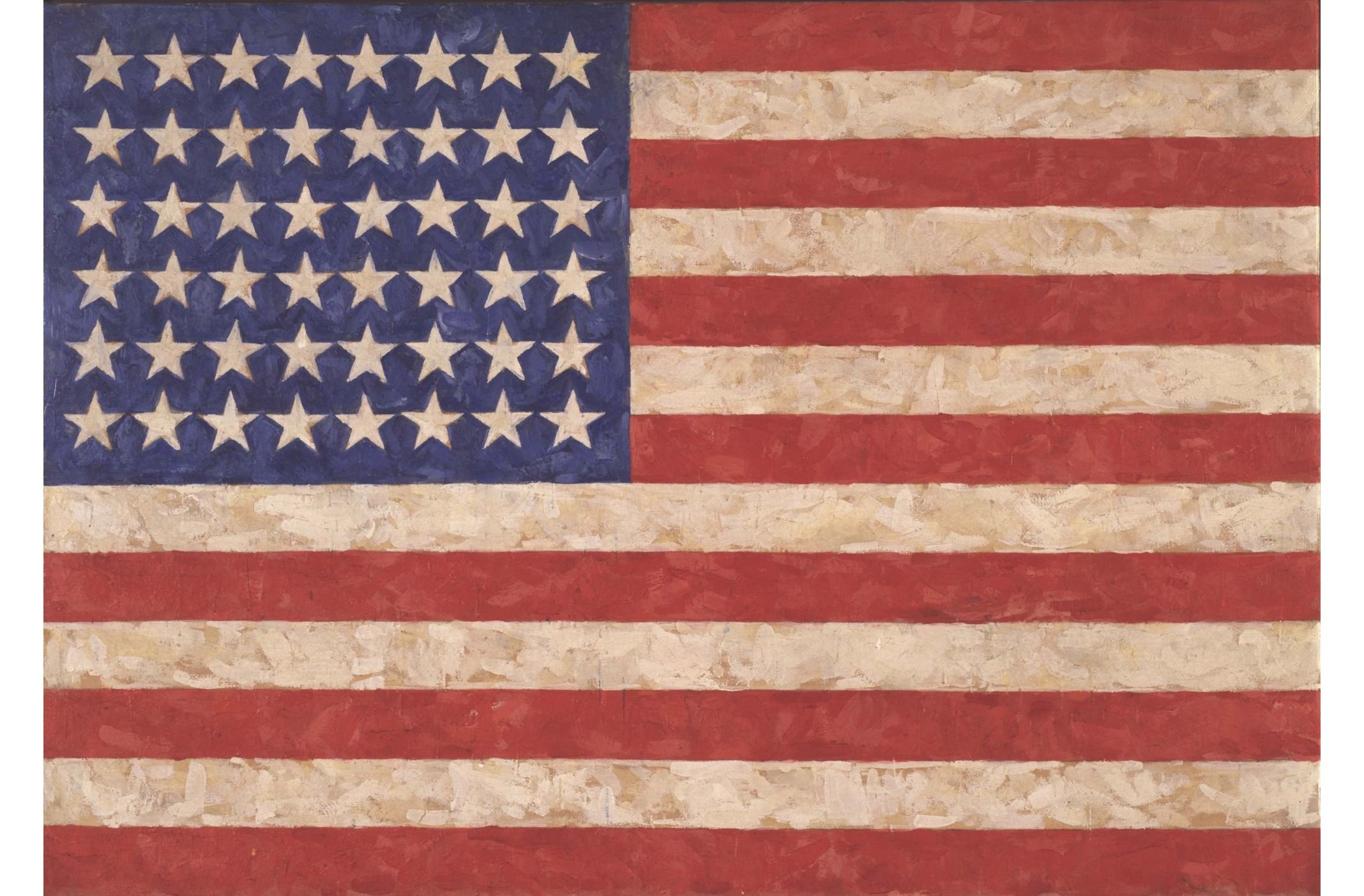 Johns created Flag using the encaustic technique, an ancient art form in which pigments are mixed with hot wax. He then layered the surface with strips of newspaper and fabric.