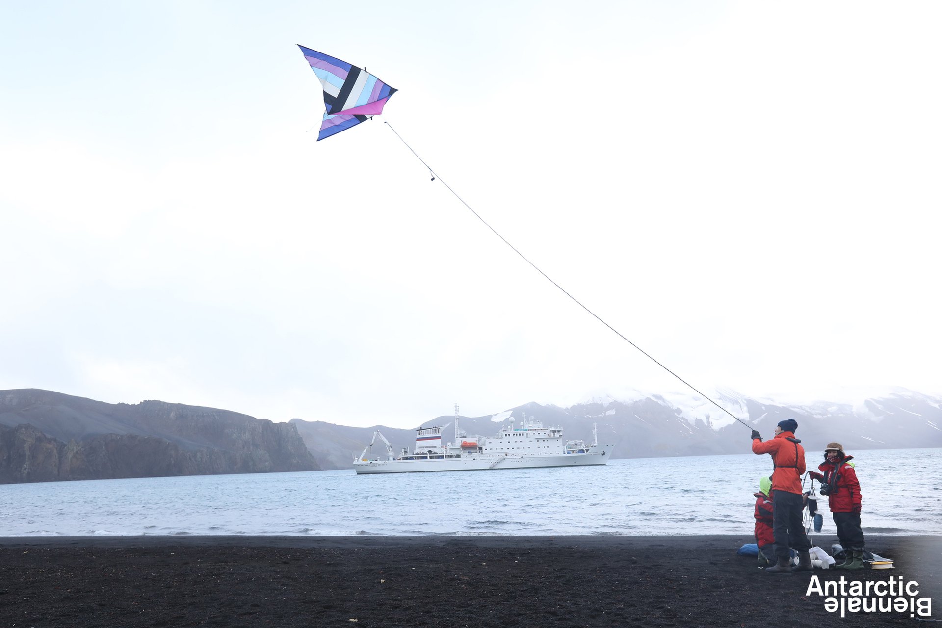 Avoiding the snapping seals we walked to the highest ridge, stark volcanic slope, and a view over the sea and little shingle beach below. One can see the magma, the actual rock of the lava flow. Here Nathaniel Palmer established a ‘sealing station’, which has such an efficient, scientific ring, but the hideous, reeking reality one would rather not imagine. This whole black beach so long given over to systematic slaughter. The only thing to lift our spirits was that Yasuaki Igarashi, the Queen of Shiba, was finally able to fly his kite, a soaring treat as if designed by Emilio Pucci, wonderful 1970s candy stripes. A whole row of people with bare white legs in the steaming black sand, so warm from the volcano underfoot, digging my feet deep I feel the amazing heat seeping up from the broiling, angry ground. So happy to escape back to our boat from this accursed bubbling wasteland.