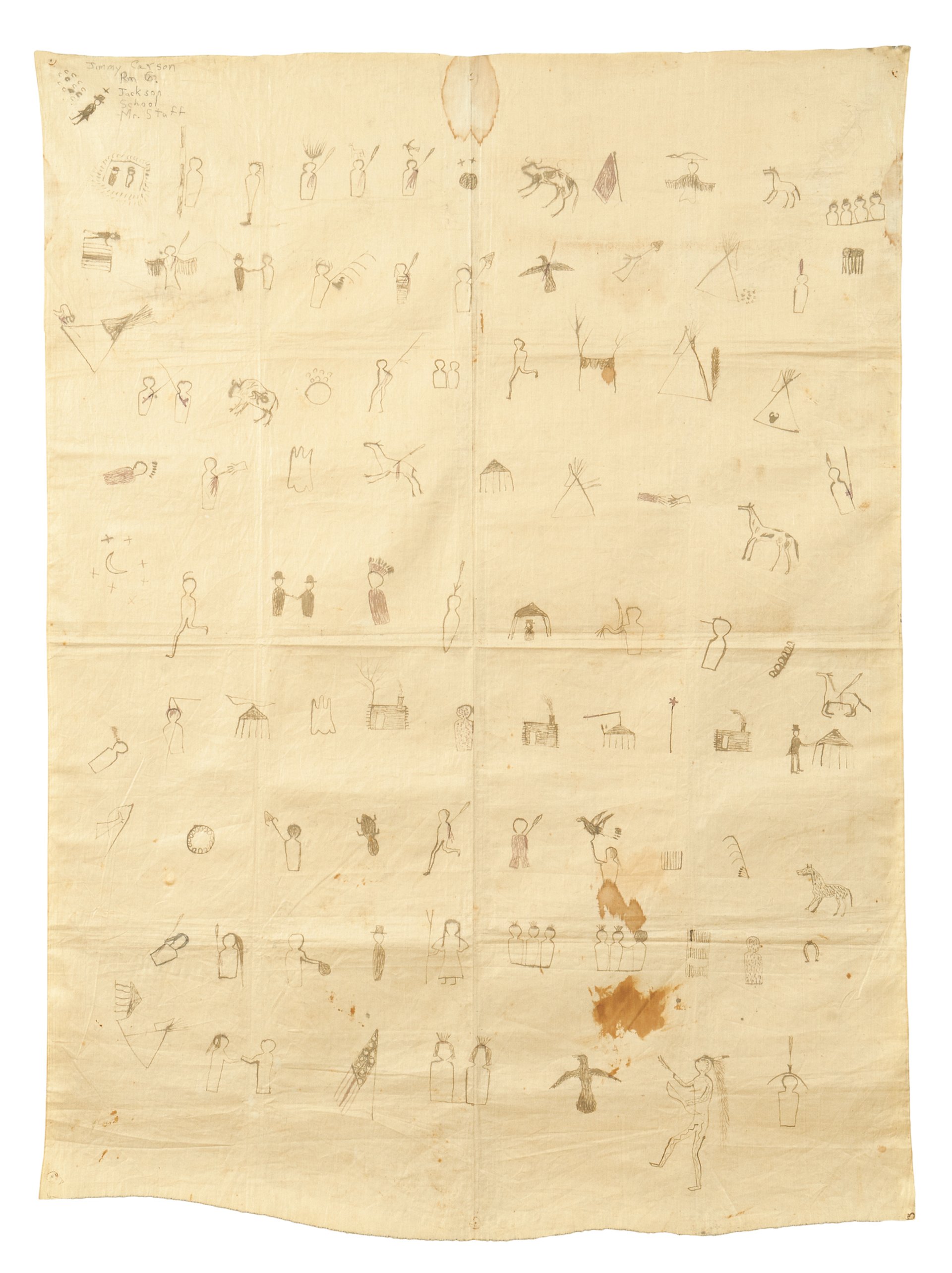 As part of its annual auction of indigenous arts and crafts, the auction house is offering a muslin winter count from the Dakota Sioux tribe, put up by the heirs of US General Henry Martyn Lazelle, who fought against the Sioux in South Dakota in 1877, during the American-Indian Wars. Winter counts are pictorial calendars made by the Sioux to track years, offering a more authentic history of the lives of native tribes than accounts recorded by foreign colonisers. Pictograms serve to mark “the most memorable event that happened for that particular tribe”, says Douglas Deihl, a specialist of the department. Originally painted on buffalo hides, before the animals became scarce and the tribes were confined to reservations, winter counts’ designs can vary, employing lines, or spirals. They were often duplicated in different mediums, as was this example covering the years 1786-87 to 1876-77 and depicting the deaths of warriors among the key events. The most recurring entry in winter counts across various tribes is the Leonid meteor shower of 1833—known as the ‘The Year the Stars Fell’—when thousands of shooting stars were visible in the North American continent for three nights. Although this particular winter count is “not in colour and somewhat basic, with the drawings a bit on the crude side, it’s exceptional quality-wise, as it was collected in the 1870s—considered fairly early for this type of object”, says Diehl.