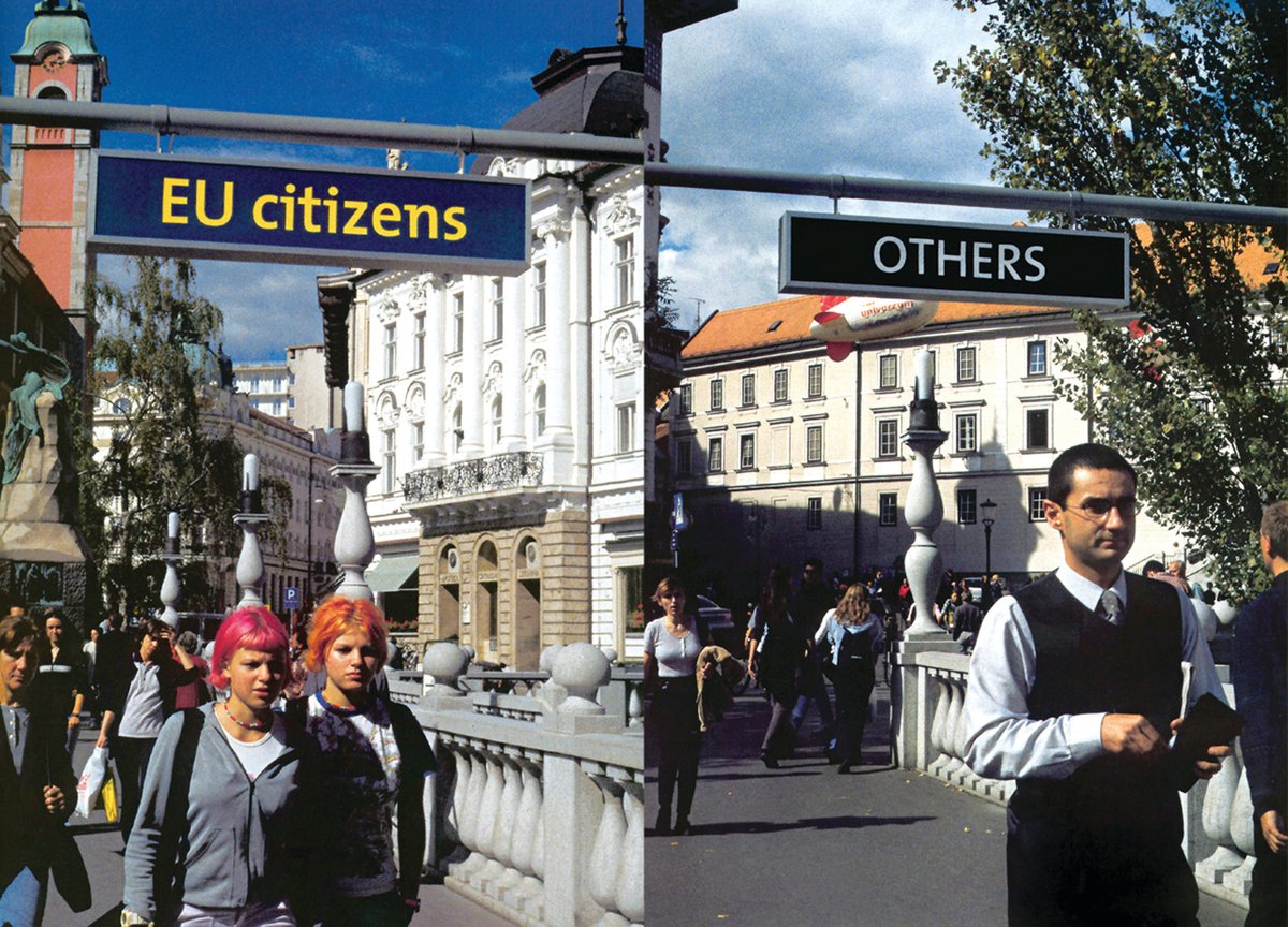 Visitors to The Restless Earth, an exhibition organised by Massimiliano Gioni for the Fondazione Trussardi and Triennale Museum in Milan, enter the show beneath one of two lightbox signs: EU or Others. Created by the artist Sejla Kameric for the third Manifesta biennial in Ljubljana in 2000, they mimic the border control signage she encountered while travelling between Slovenia—which had already started the process of joining the European Union—and her native Bosnia, which still remains outside the bloc today.