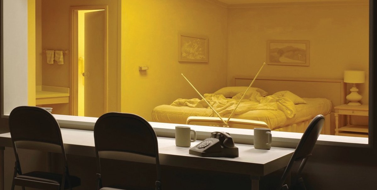 The artist Roxy Paine has taken on the CIA’s use of LSD on non-consenting civilians in his two-part solo show Farewell Transmission (2 May-1 July) in Paul Kasmin Gallery’s spaces on Tenth Avenue in New York. As part of a mind-control experiment in the 1950s and 1960s—dubbed Operation Midnight Climax—the CIA hired prostitutes to lure civilians to safe houses in New York and Los Angeles, where they were drugged with LSD and observed by agents behind two-way mirrors. Paine’s diorama, entitled experiment (2015), is a small-scale model of one of these set-ups—a “nondescript, could-be-anywhere motel room” seen through a two-way mirror, which feels “as if the homo sapien is being observed” in a museum vitrine-like display, says the gallery’s director, Mariska Nietzman. The eerie work even has rumpled bedsheets, deceptively executed in wood.