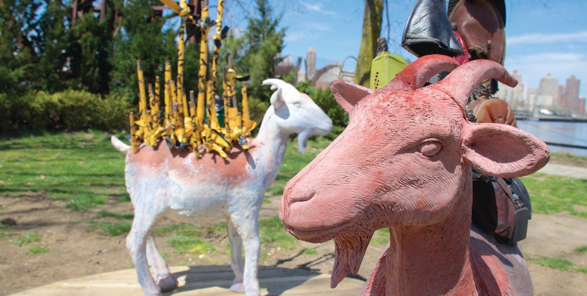The show, which takes its name from the acronym for the Greatest of All Time, is the park’s first solo artist presentation. It features six new bizarre and playful site-specific commissions, including a series of cast concrete goats piled with various materials, such as twisted fire hoses, that dot the grass like lawn ornaments. There is also a 40ft long hobbyhorse goat and a large bell that resembles a billy goat’s testicles.