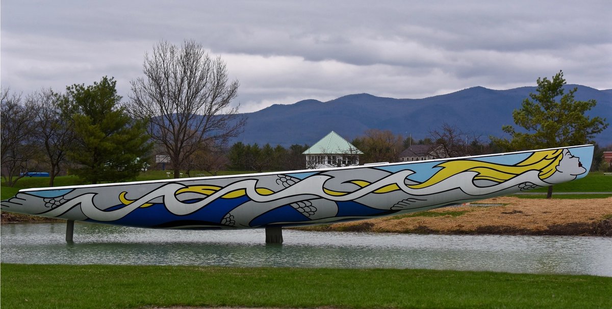 Bogosian's film includes rarely-seen footage of Lichtenstein at work, the ship's christening and its trip from the Storm King Art Center in Windsor, New York, where it is part of the collection, to Middlebury, where it is now on view. In Vermont, the boat has been installed to reveal its mermaid motif as fully as possible. "It's floating a foot off the surface, so you can see the whole bottom of the boat," Bogosian says.
