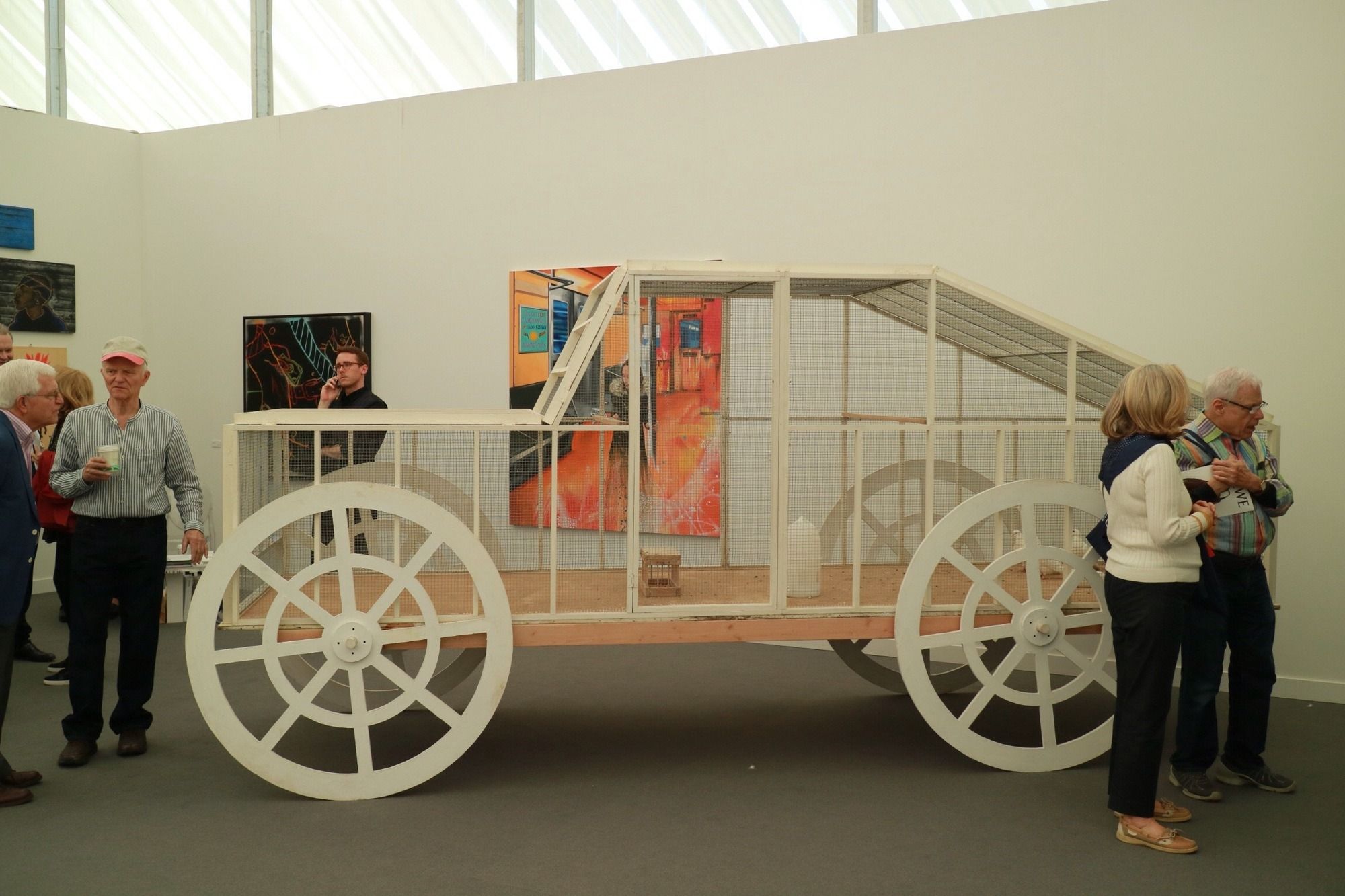 Wendy Olsoff, the cofounder of PPOW, says the inspiration for her presentation of works (both historical and contemporary) by Charlie Ahearn, Chris Daze Ellis, Anton van Dalen, David Wojnarowicz, and Martin Wong was a “disappearing New York”. All five artists were active in the East Village and Lower East Side when pioneering galleries like PPOW and Civilian Warfare began cropping up—Wojnarowicz’s triptych Peter Hujar Dreaming (1982) hung over the latter’s storefront. At Frieze, it hangs above The Pigeon Car, a coop complete with live birds in the shape of a station wagon that van Dalen built in 1987 for a show at Exit Art—both a reflection of his pigeon-keeping hobby, which brought him in touch with a melting pot of fellow immigrants, as well as a commentary on their treatment in the US. More recently, his painting Bird Walker of Chinatown (2012-13) nods to the area’s still-changing demographic with a silhouetted figure in Ugg-like boots traipsing up the street. Displayed along with paintings documenting street culture by Ahearn, Daze, Wong, the works speak to an era when art was defined by practice, not product.