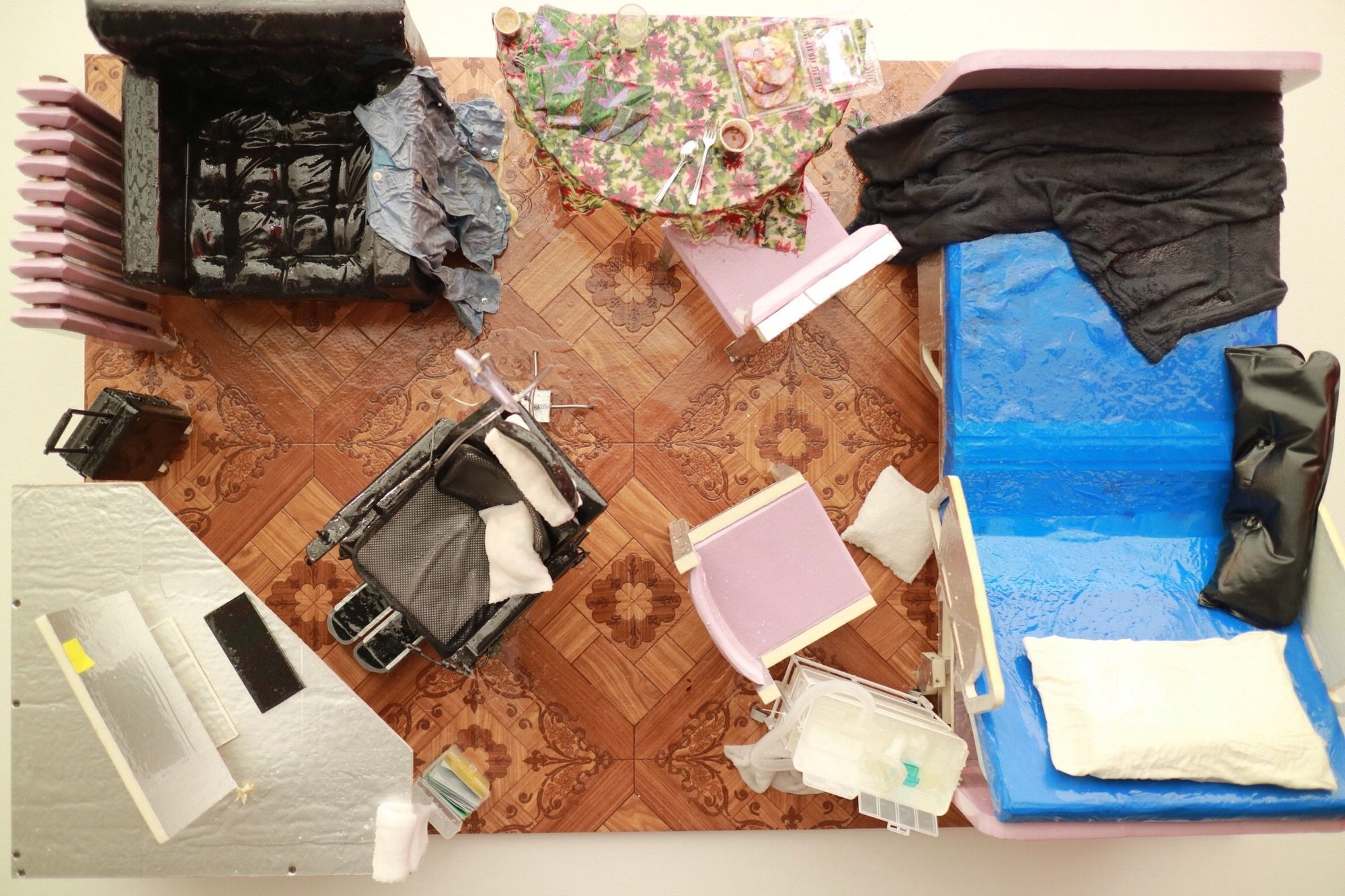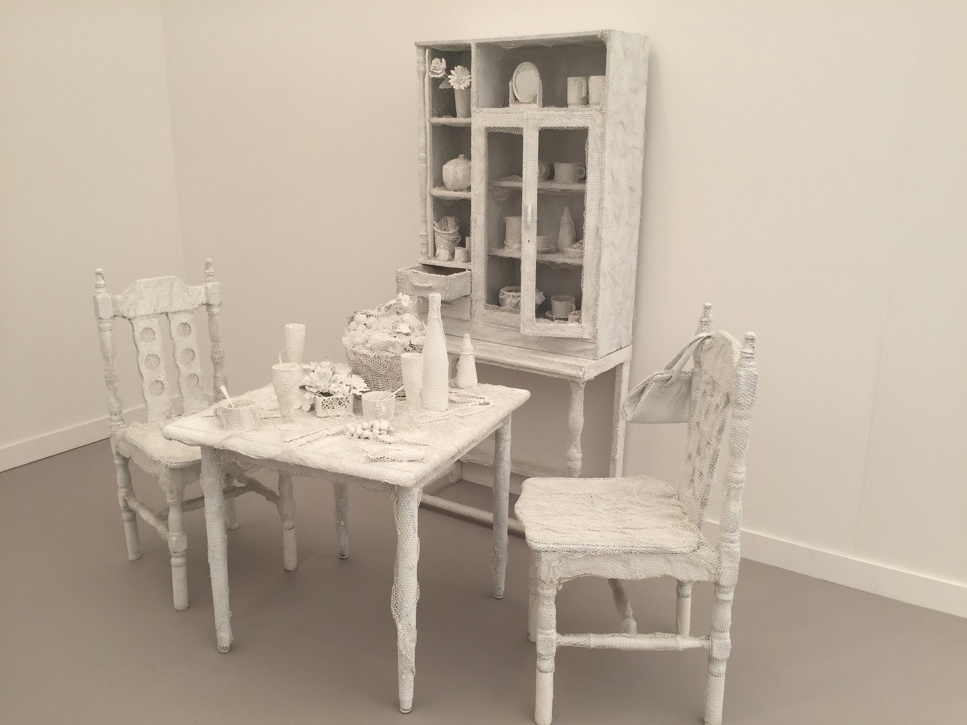 Ready to eat? At Victoria Miro, Yayoi Kusama brings a spectral quality to Solitude of the Earth (1994), an all-white dining room setup enshrouded in wire mesh. A lived-in, miniaturised interior by Samara Golden—The Meat Grinder’s Iron Clothes are mine (2017), featuring lumpy cushions and a congealed cup of coffee—is affixed at a 90-degree angle to the wall at Night Gallery. According to gallery director Davida Nemeroff, the piece is, among other things, a “heartfelt portrait of domesticity and its realities”.