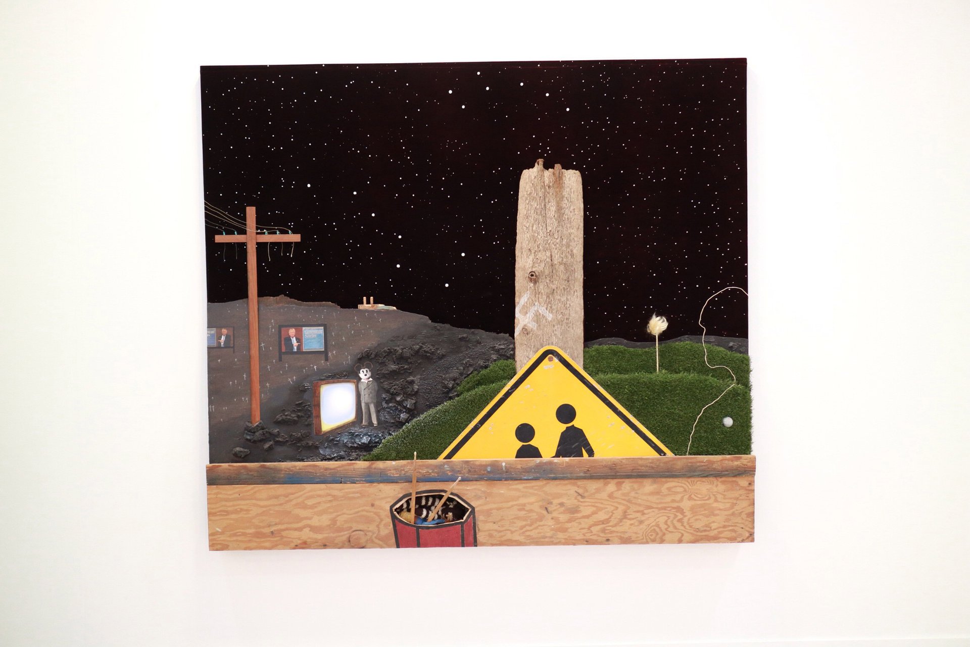 In Llyn Foulkes’s painting, President Trump’s face can be seen on two Goldman Sachs billboards, while a blonde wig sprouts from a hill. Together with a suited Mickey Mouse, they form part of a nocturnal landscape seen from a train window. “Like history painters, Foulkes has always reflected the current political moment,” says Andreas Gegner, a director at Sprüth Magers. “This is a literal landscape, but it’s also a political landscape.” The half-swastika is in fact “L.F.”—the artist’s initials. The work sold on the opening day to a New York-based collector for $325,000, a shade more than the $308,000 a day spent on Trump’s visit to the city this week.