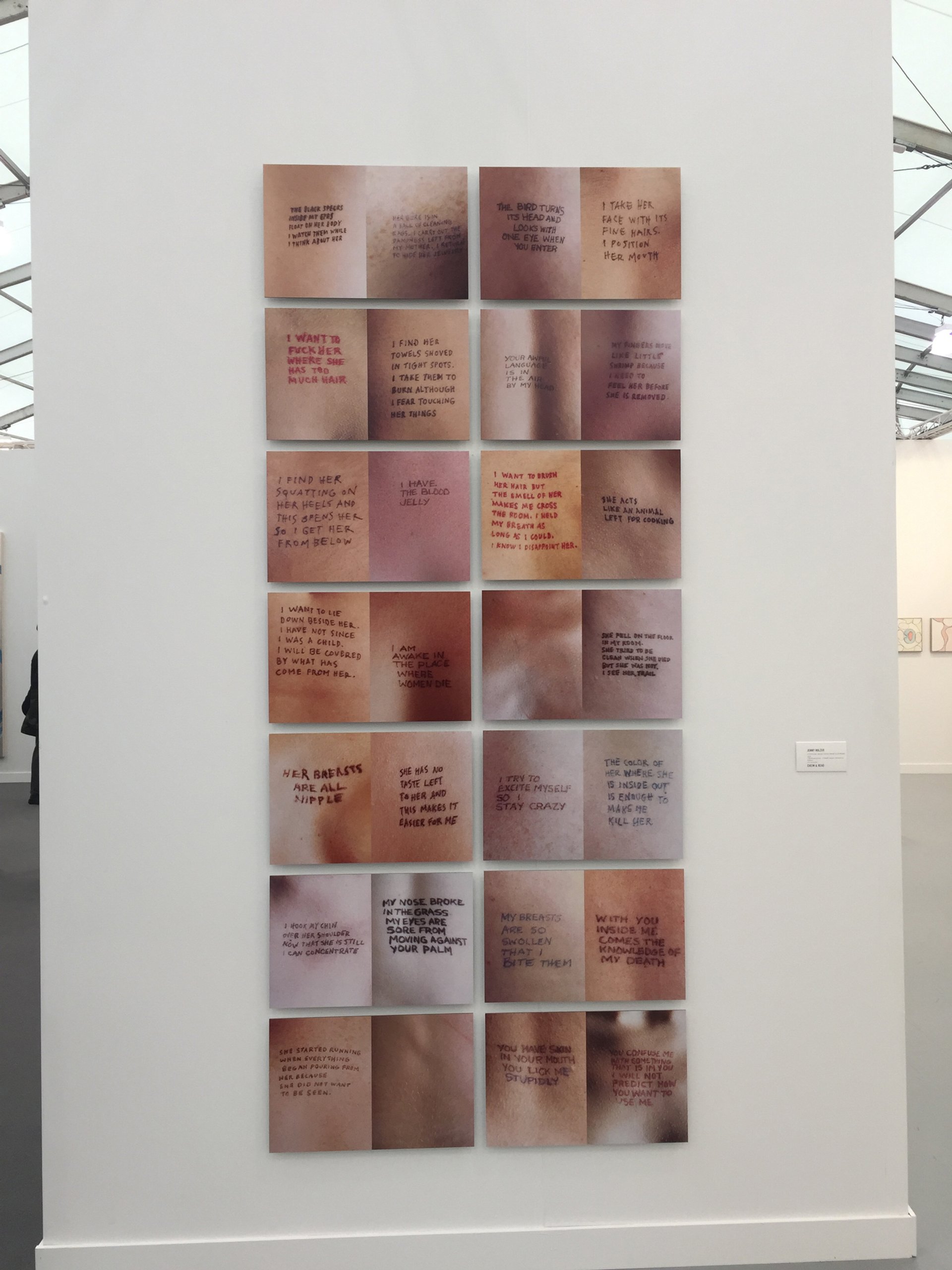 The US artist Jenny Holzer is showing a series of images of texts inscribed on skin, called Untitled (Selections from Lustmord) (1994). “Lustmord was written about the targeting, and rape, of women and girls during the war in the former Yugoslavia, as military strategy. Of course, rape is routine in peacetime as well,” Holzer tells us. “The voices in Lustmord are those of perpetrators, victims and observers.” The work is priced at $45,000.
