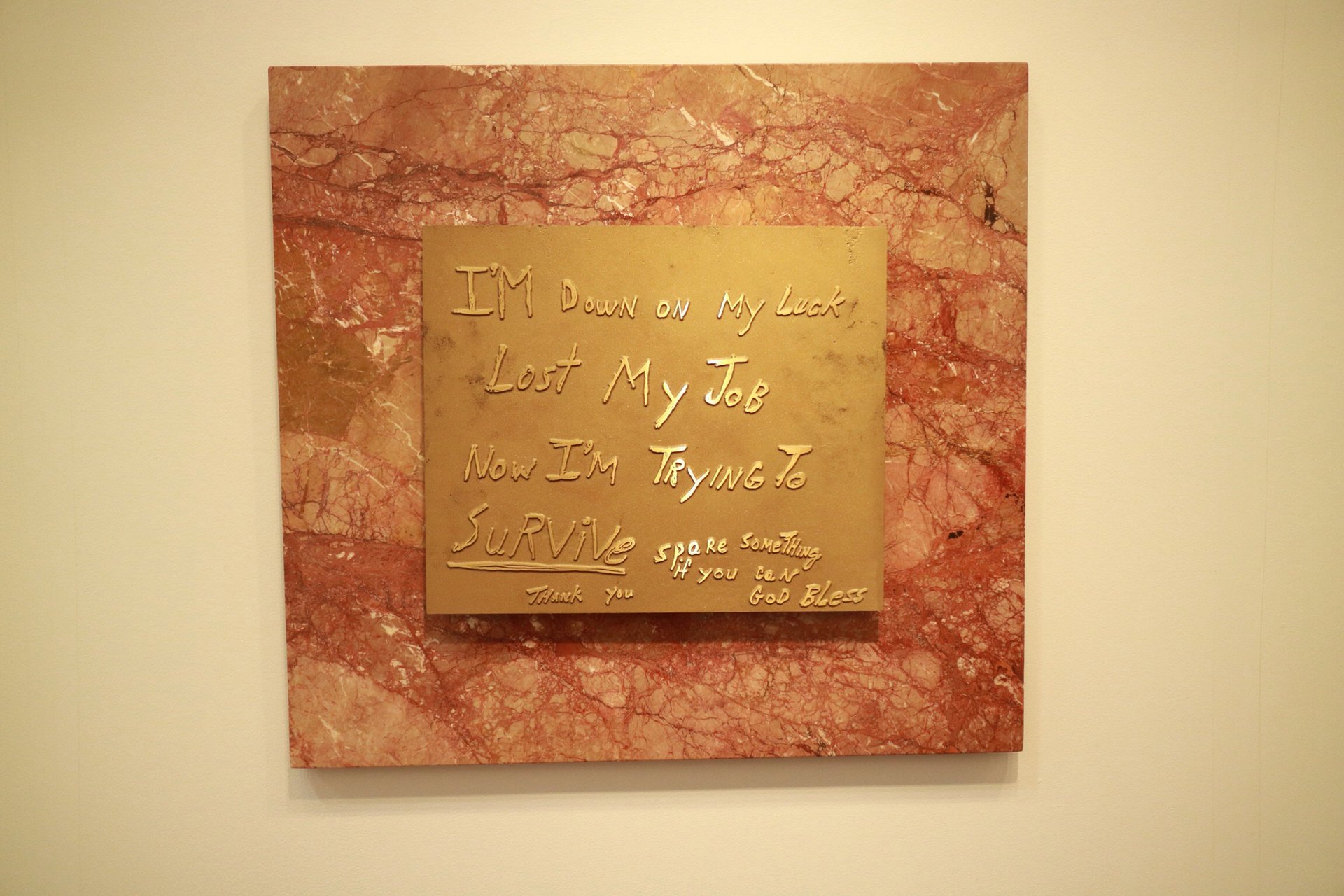 In 1989, the artist collective General Idea found a note from a homeless person scrawled on a piece of cardboard outside their New York apartment. “It was a sign of the times, so we wanted to make it into a real sign of the times,” says A.A. Bronson, the surviving member of the group (Felix Partz and Jorge Zontal both died of Aids-related illnesses in 1994). The handwritten message was cast in bronze and mounted on a slab of pink marble resembling that found in the lobby of Trump Tower. “Trump Tower stood in for a certain philosophical position towards issues of poverty and homelessness. Little did I know what the future would bring,” Bronson says. The work sold for an undisclosed sum during the VIP preview of the fair.