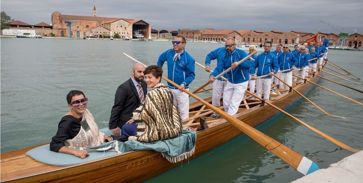 New Zealand celebrated the integration of its pavilion into the main body of the Venice Biennale in grand style. The participating artist Lisa Reihana made a dramatic waterborne entrance at the new Tese dell’Isolotto Arsenale location yesterday (10 May). She arrived not just in any old gondola, but in the historic Disdotona, the largest vessel in Venice, which is only used for the most important civic occasions and requires 18 specialist rowers. Reihana, who is of Maori and British descent, was accompanied by the governor-general of New Zealand Patsy Reddy, and both were resplendently decked out in ceremonial Maori cloaks.