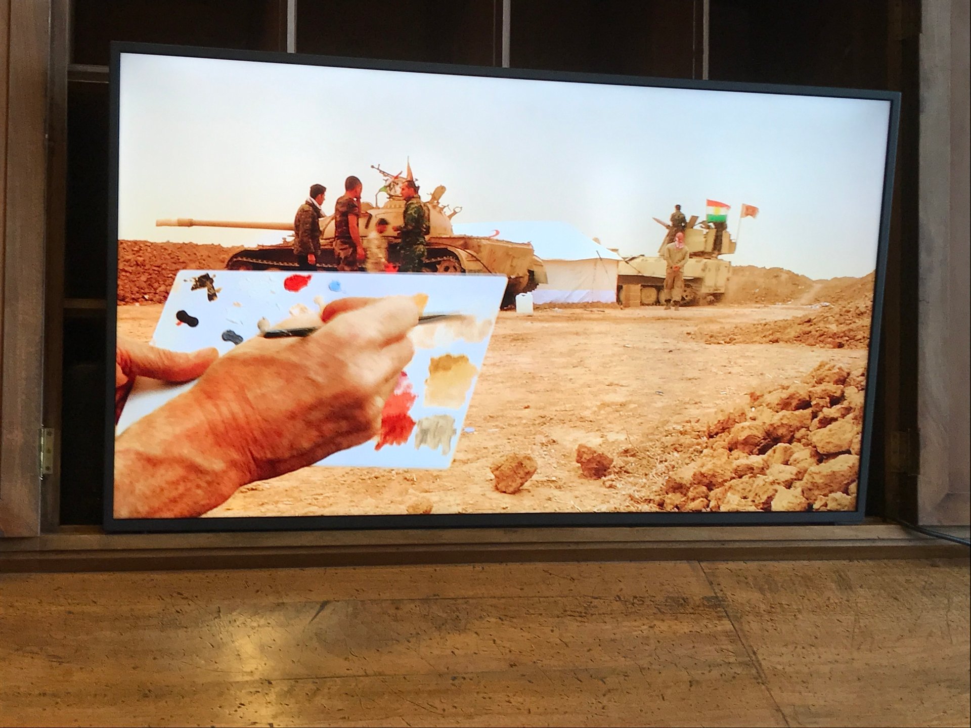 Another leading artist, the Mexico-based, Belgian artist Francis Alys, is showing paintings, drawings and a film produced on the front line in Mosul last year at the Iraq pavilion in the Palazzo Cavalli-Franchetti. Alys spent time meeting refugees of the conflict as well documenting a Kurdish battalion’s campaign to liberate Iraq’s second city from Isis. Why take on the role of a war artist? This war is “medieval barbarism perpetrated and spread with the most modern of technologies”, Alys recently told Artforum. The Baghdad-based Ruya Foundation, the pavilion commissioner, also invited Alys on a research trip last year to refugee camps in northern Iraq where he held a series of workshops.